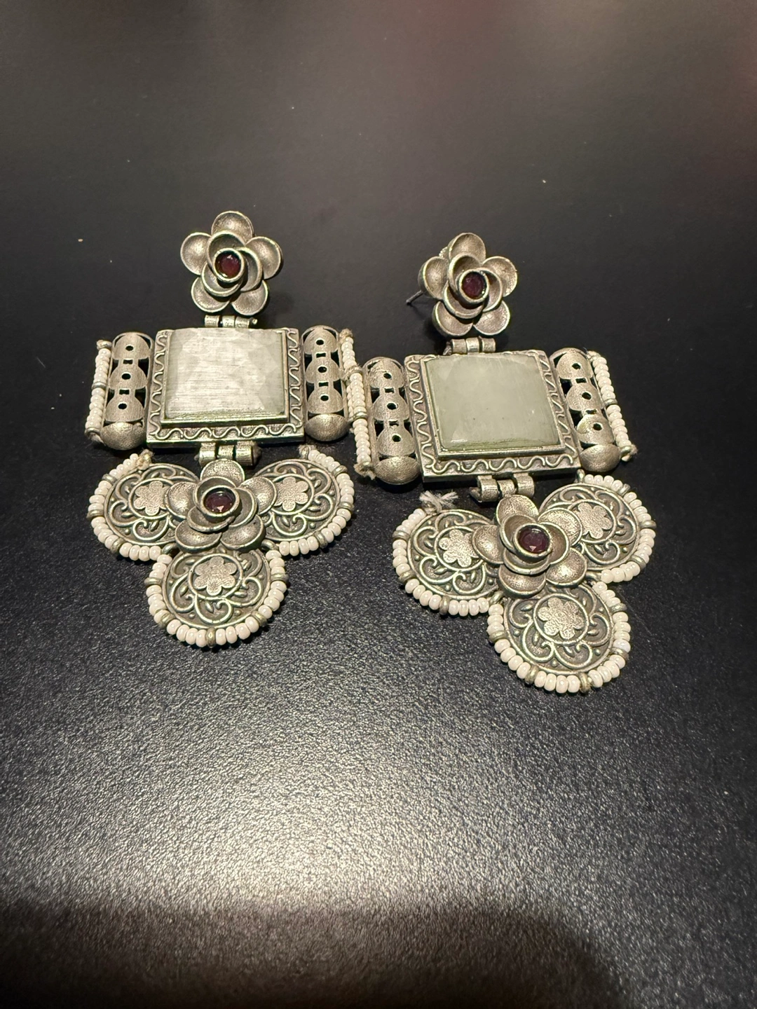 Beautiful handcrafted earrings. Intricate detailing. Features a square green stone and floral accents. White beads accent the design.