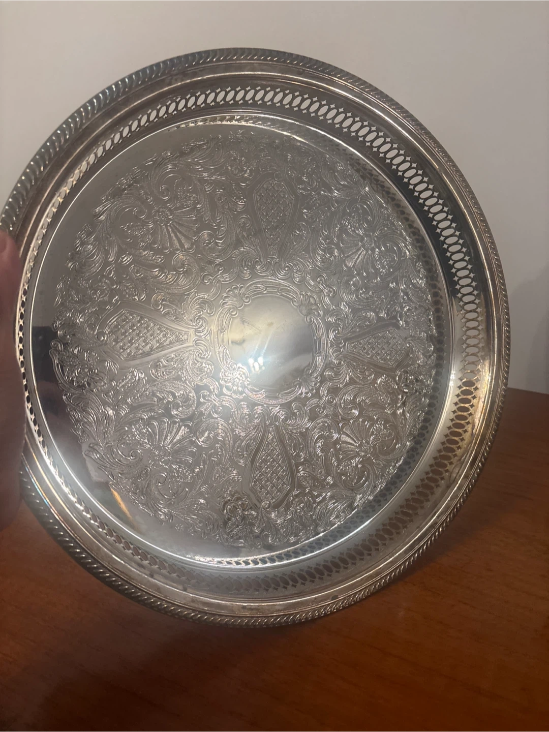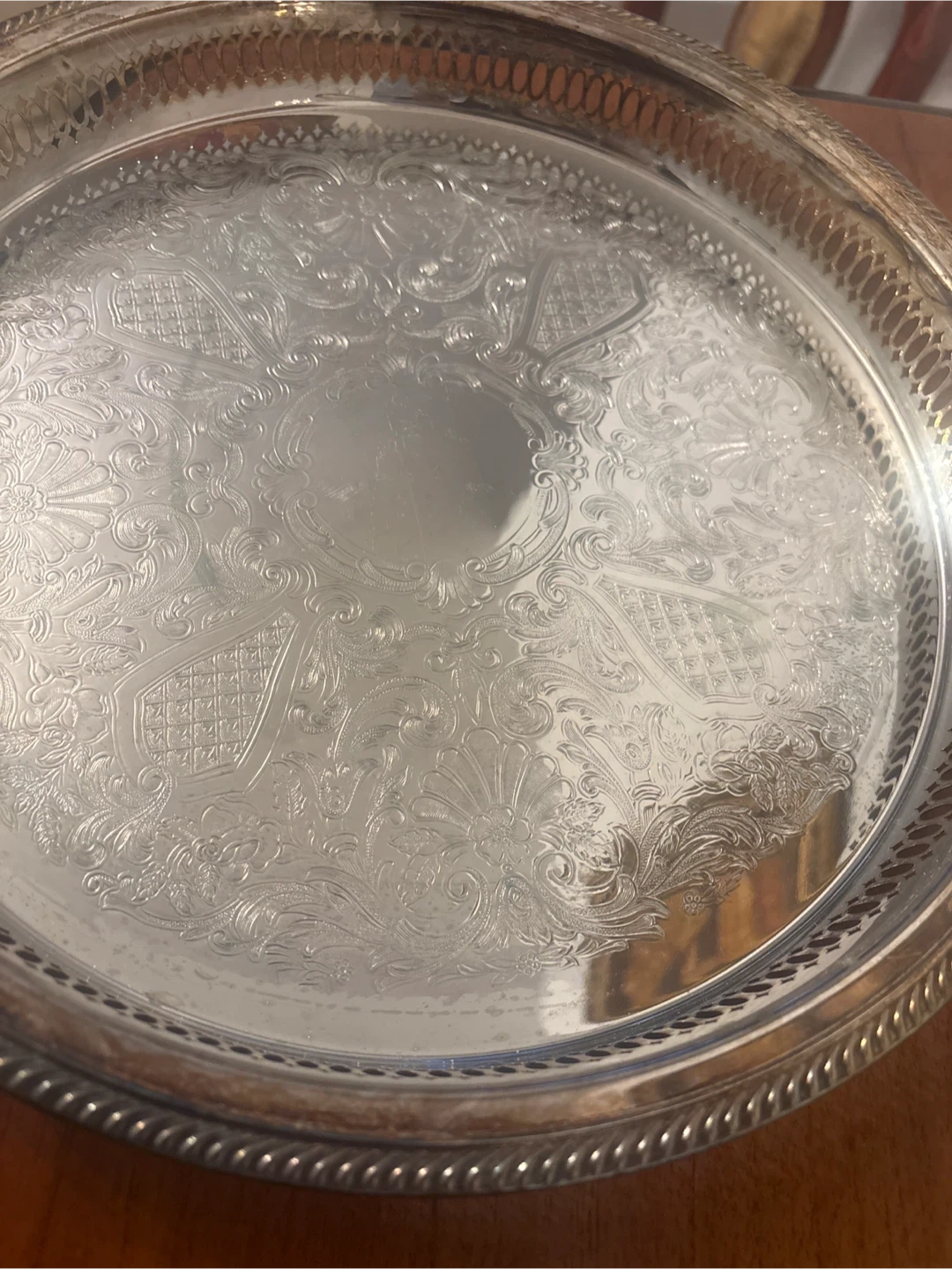 401Selling a silver plated serving tray. It has a lovely, intricate design. Perfect for serving drinks or displaying items!