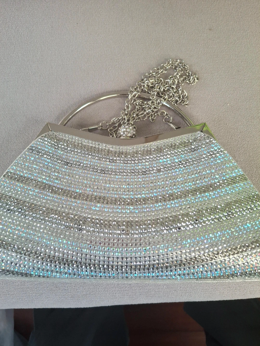 60This is a beautiful silver evening bag covered in rhinestones! It has a silver handle and a delicate chain strap. Perfect for a special occasion or a night out!