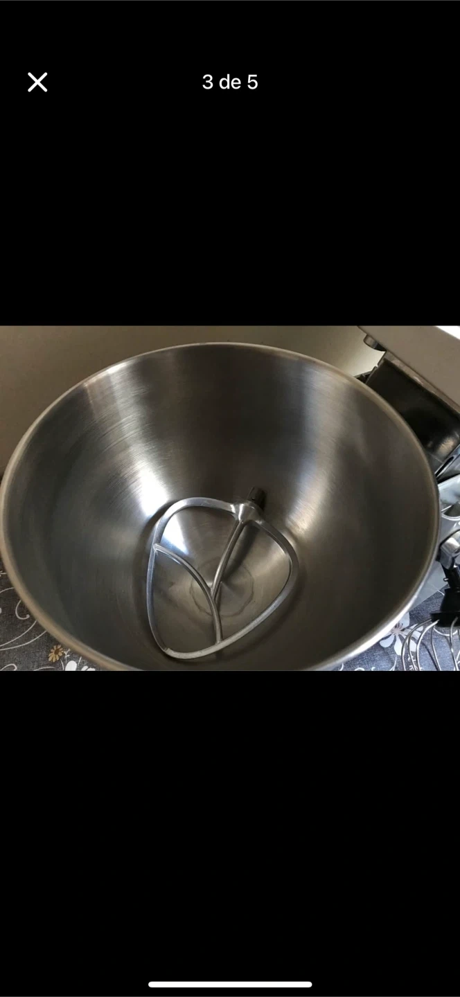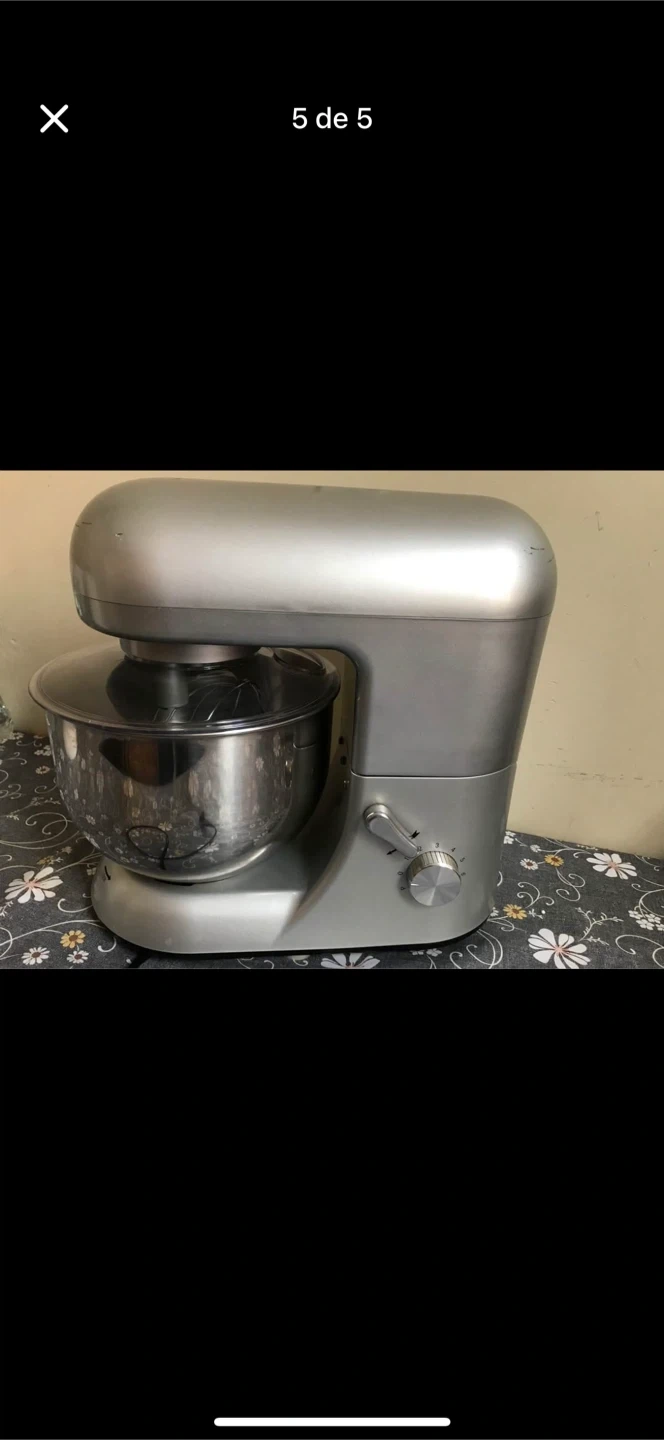 Selling a stand mixer in silver color. It comes with a stainless steel bowl and several attachments, including a whisk, dough hook, and beater. It is in good condition and ready for your baking needs. 14 in x 14 in