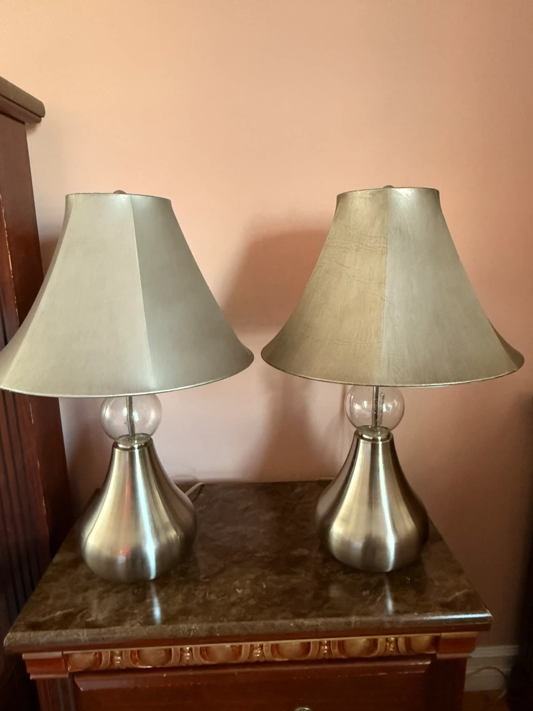 65Selling a set of two silver table lamps! They have a modern design with a clear glass ball accent and a silver-colored shade. Perfect for adding a touch of elegance to any nightstand.