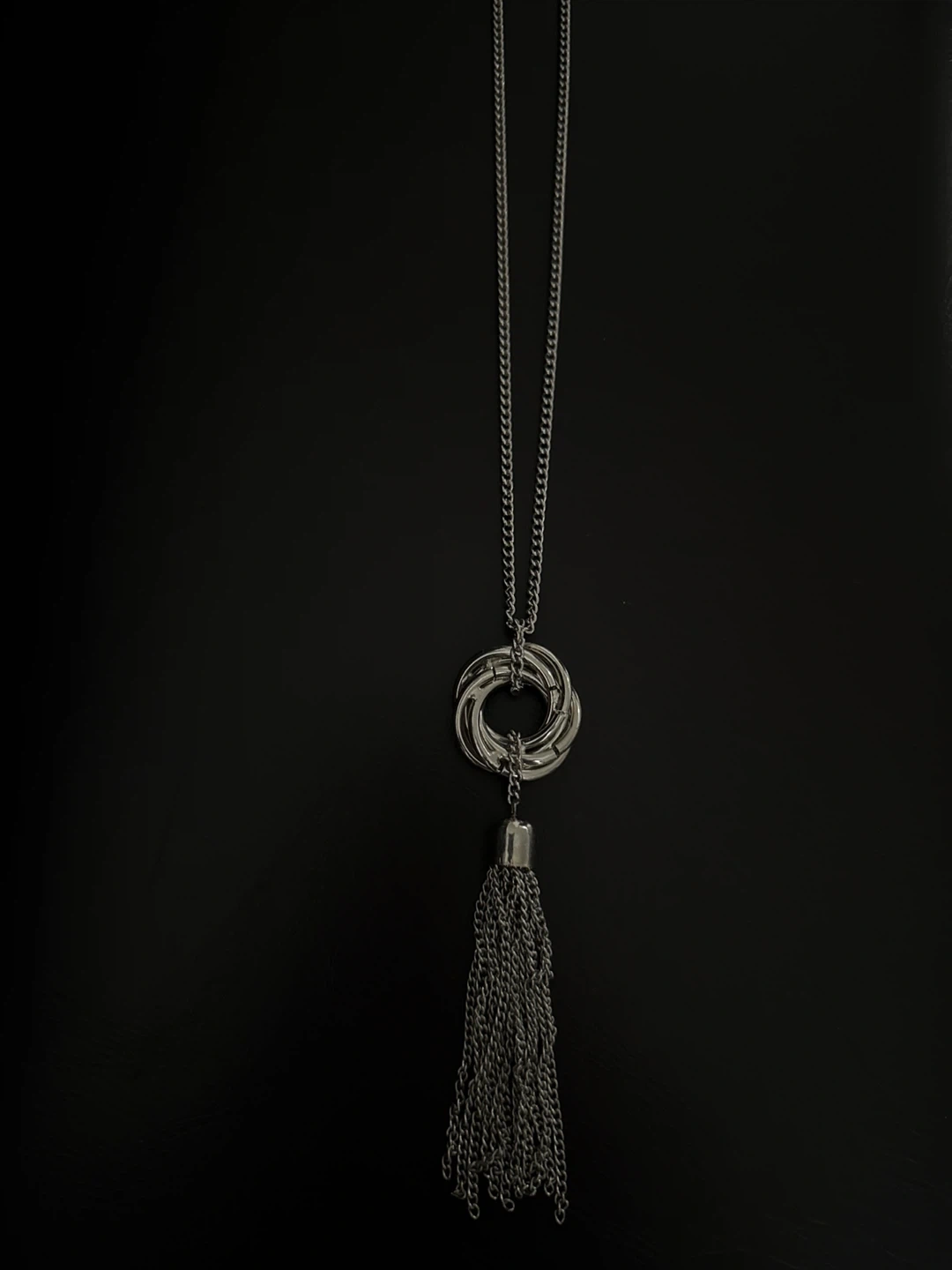 10Selling a silver-colored pendant necklace! It features a unique circular design with a tassel. Perfect for adding a touch of elegance to any outfit