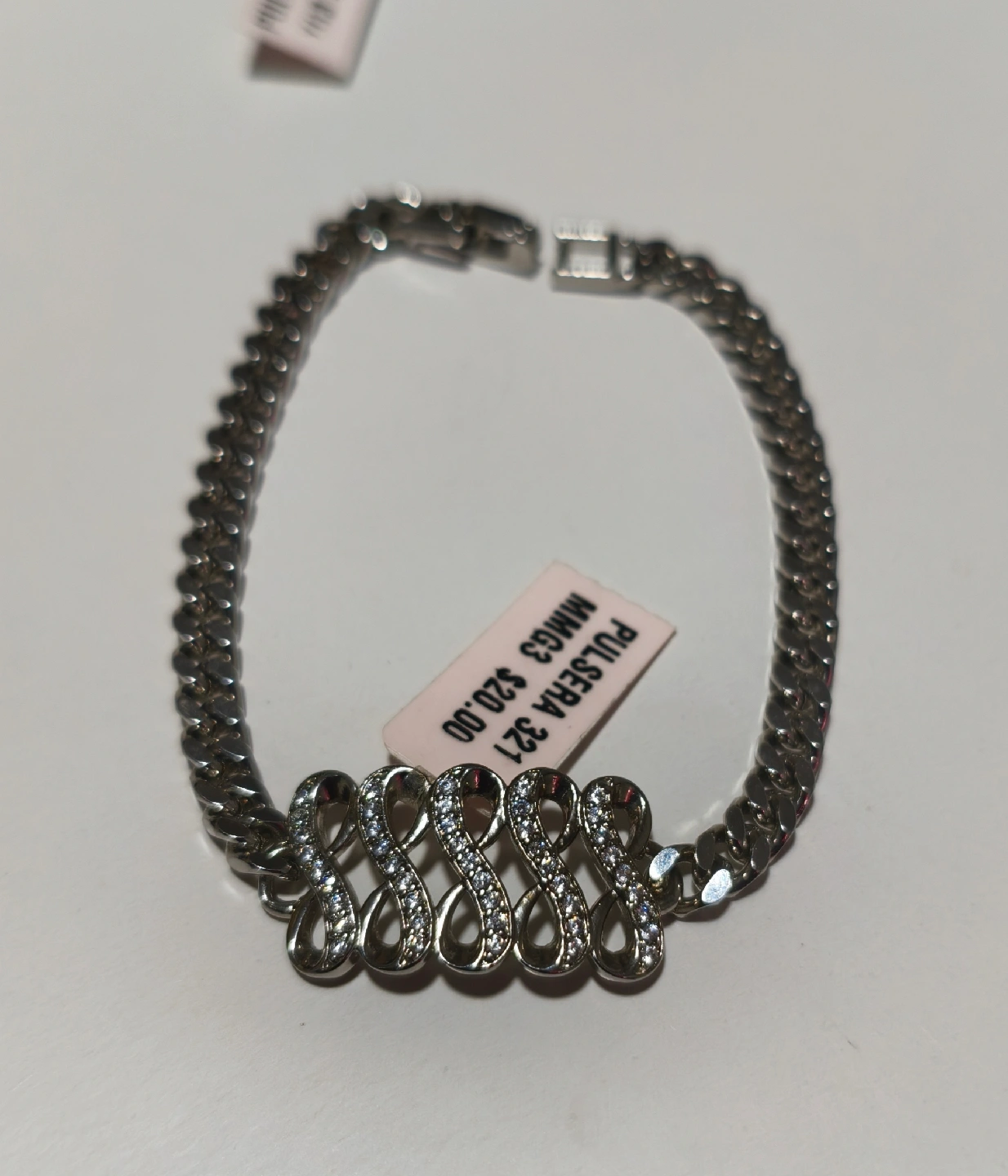 Selling a silver-tone bracelet. It has a really nice design with what looks like little gems in the center. The tag says it was $20!