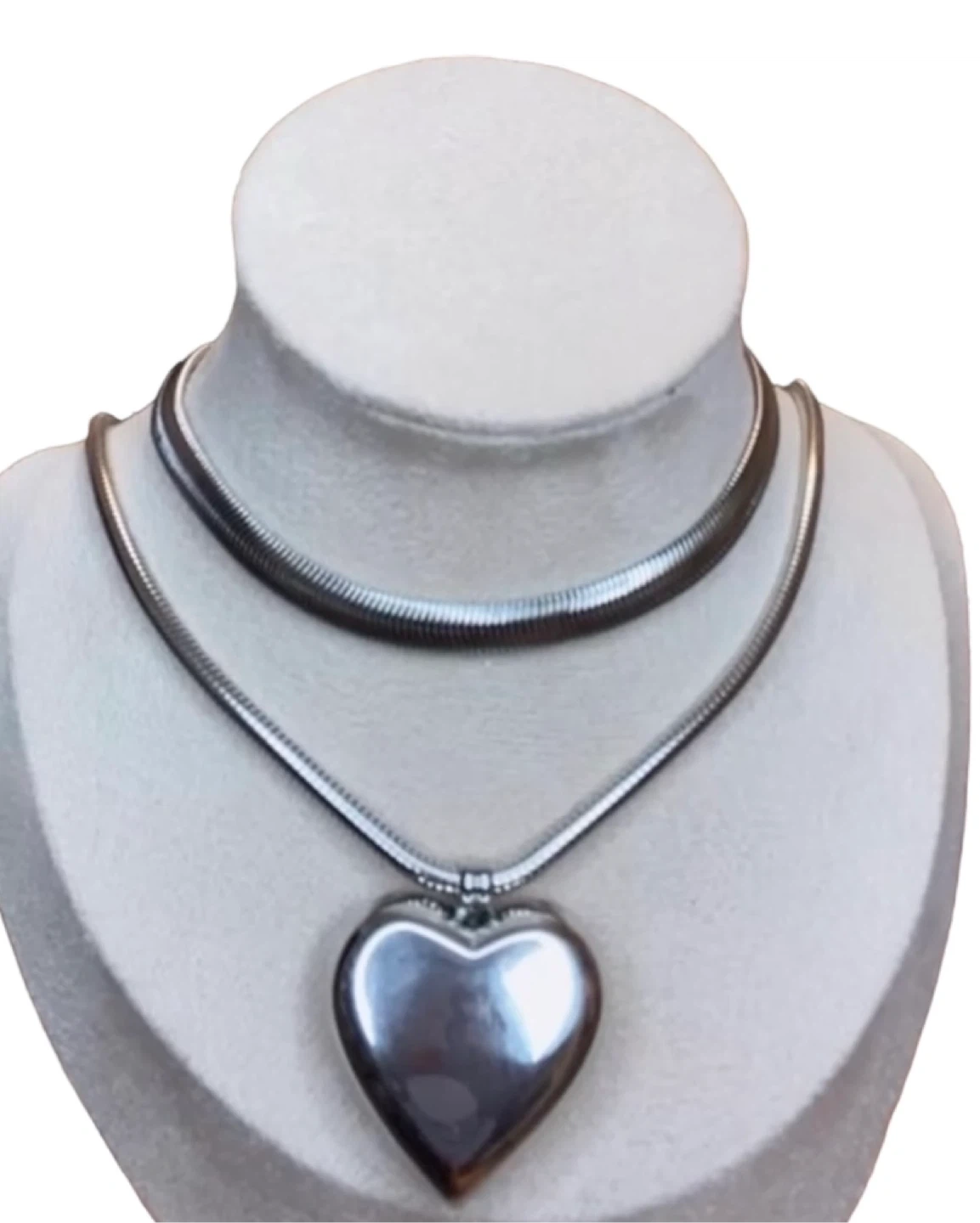 60This is a cute silver-tone necklace set. It includes a shorter snake chain and a longer necklace with a heart pendant. Perfect for adding a little sparkle to your outfit! Both are new, stainless steel. You can get both or one for $12