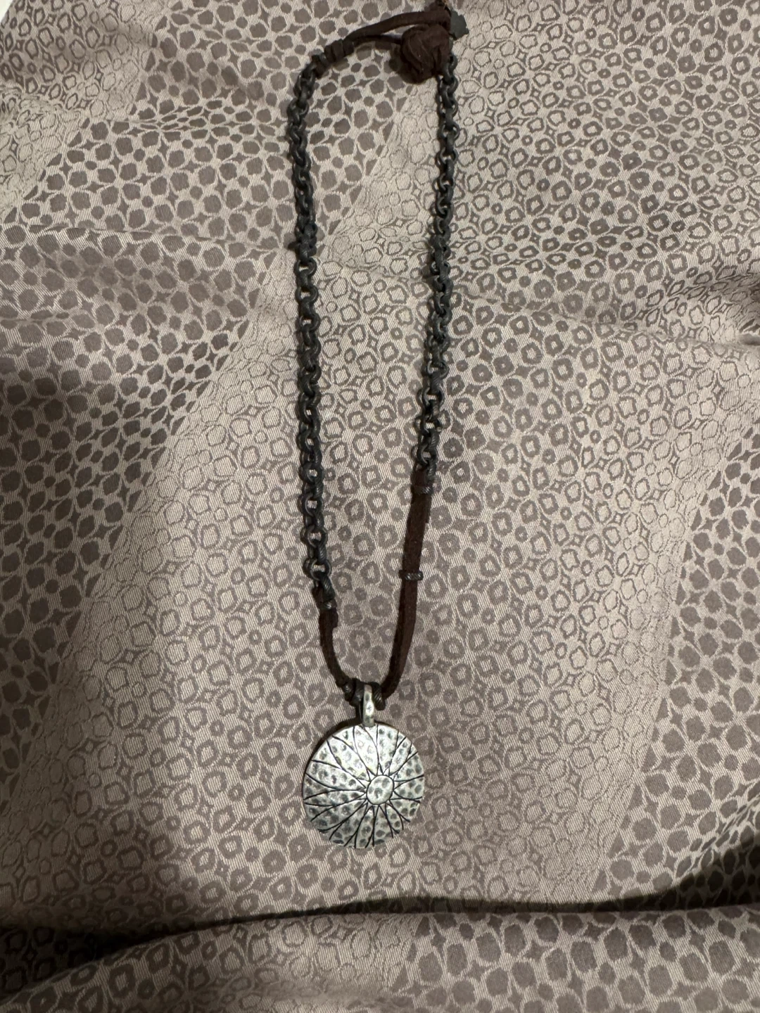 Selling a silver tone medallion necklace with a brown cord and dark chain. It's in great condition and ready for a new home!