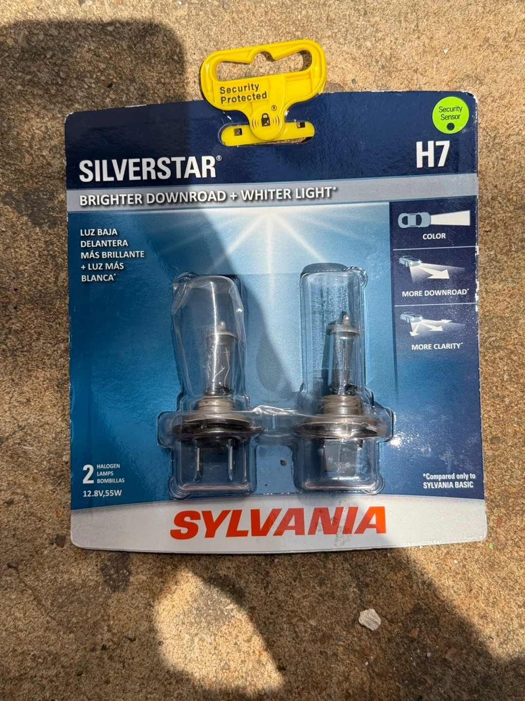 Selling a new set of SilverStar H7 halogen headlight bulbs. These bulbs provide brighter downroad and whiter light for improved visibility. They are 12.8V, 55W.