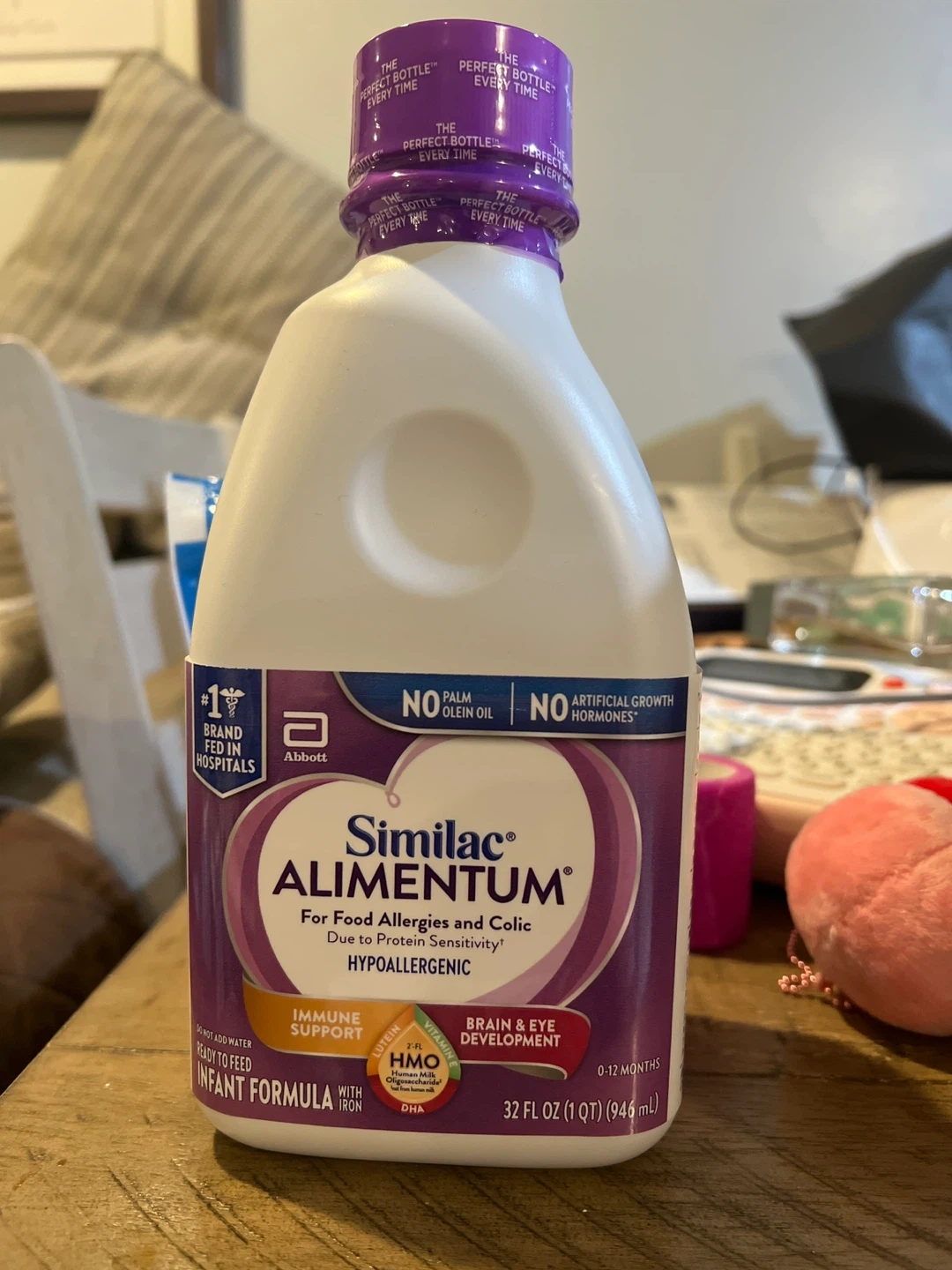 Selling a 32 fl oz bottle of Similac Alimentum infant formula. It's ready to feed and is hypoallergenic, designed for food allergies and colic. It supports brain and eye development and contains HMO for immune support.