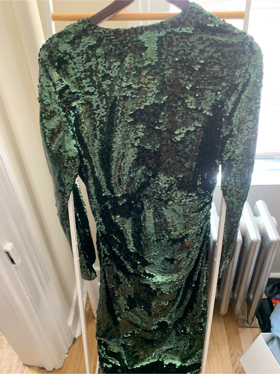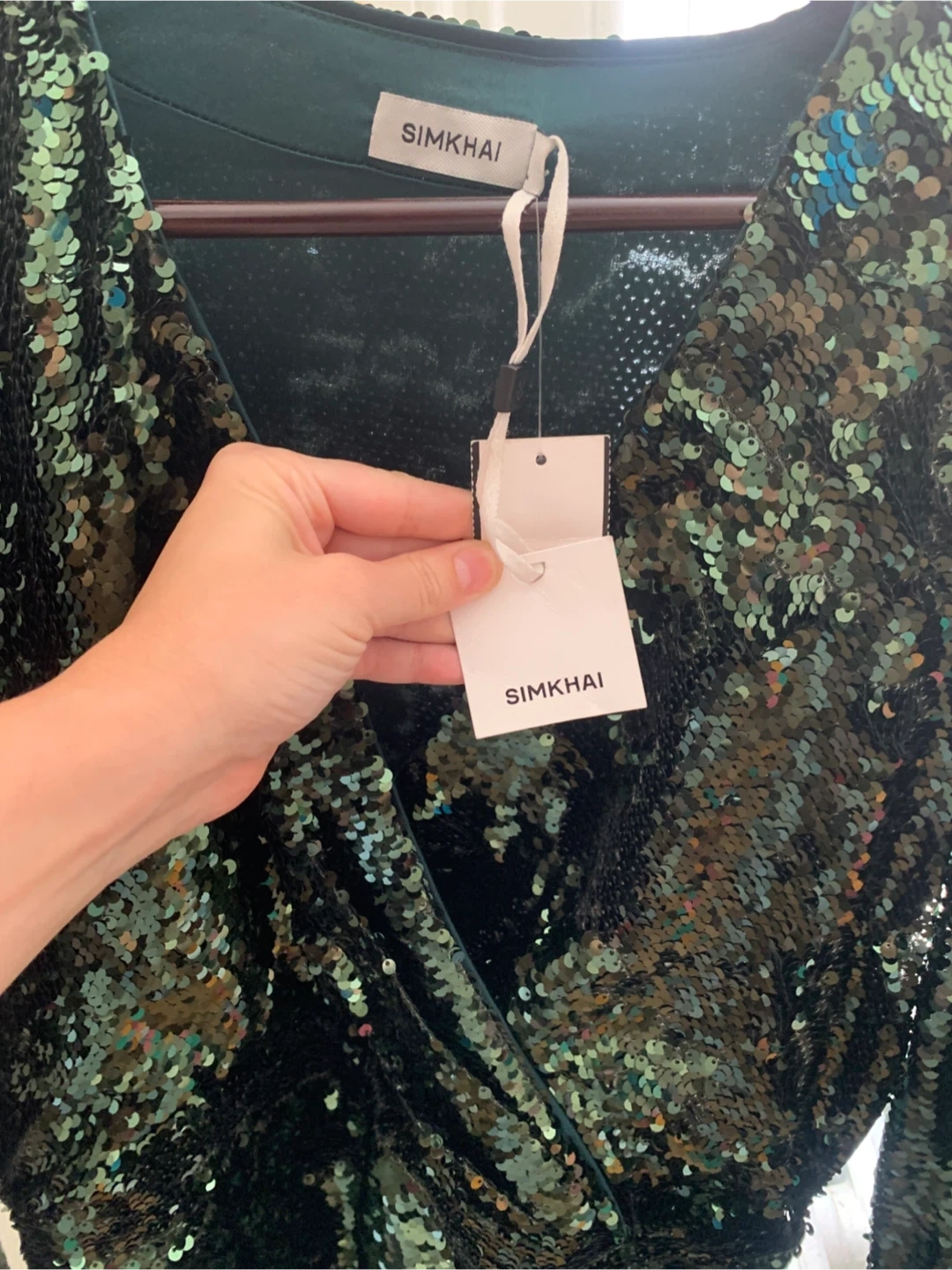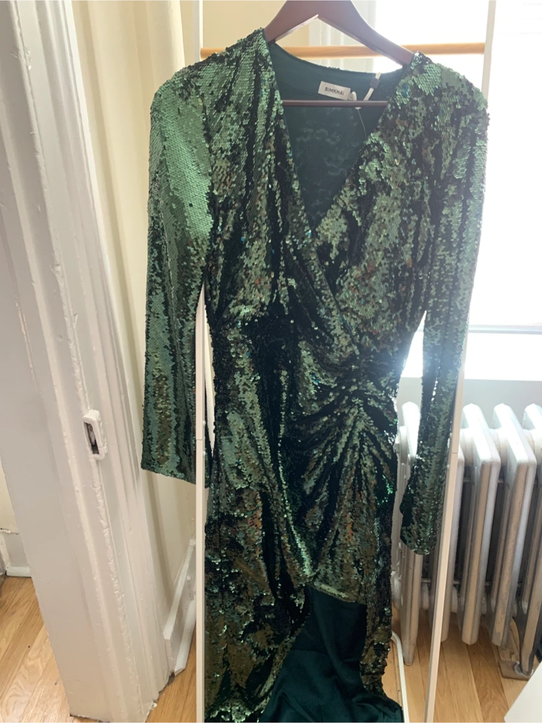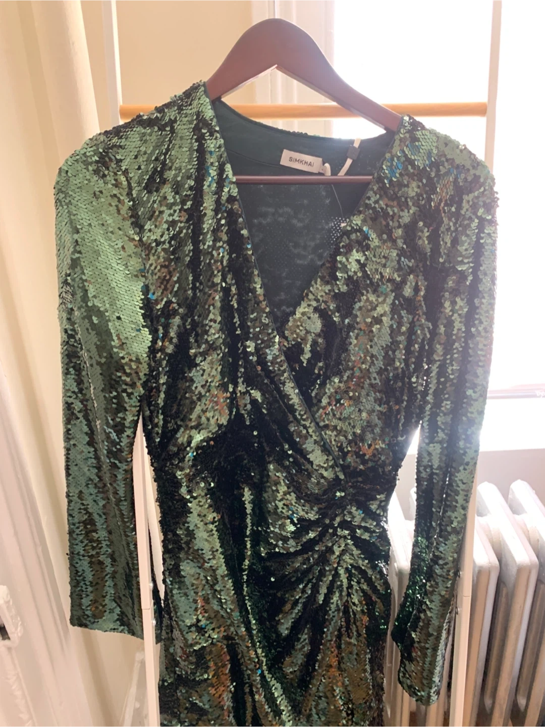 Selling a SIMKHAI sequin mini dress. The dress is a beautiful green color with all-over sequins. It has a wrap style and long sleeves. Perfect for a night out!