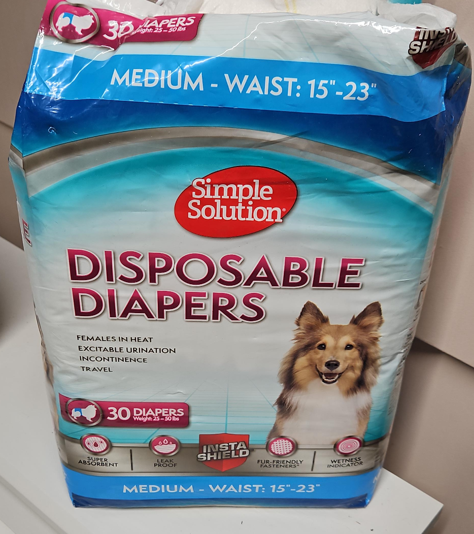 Selling a pack of Simple Solution Disposable Diapers for female dogs. These are size medium, designed for waists 15-23 inches and dogs weighing 25-50 lbs. They are super absorbent, leak-proof, and feature fur-friendly fasteners and a wetness indicator. Perfect for females in heat, excitable urination, incontinence, or travel!