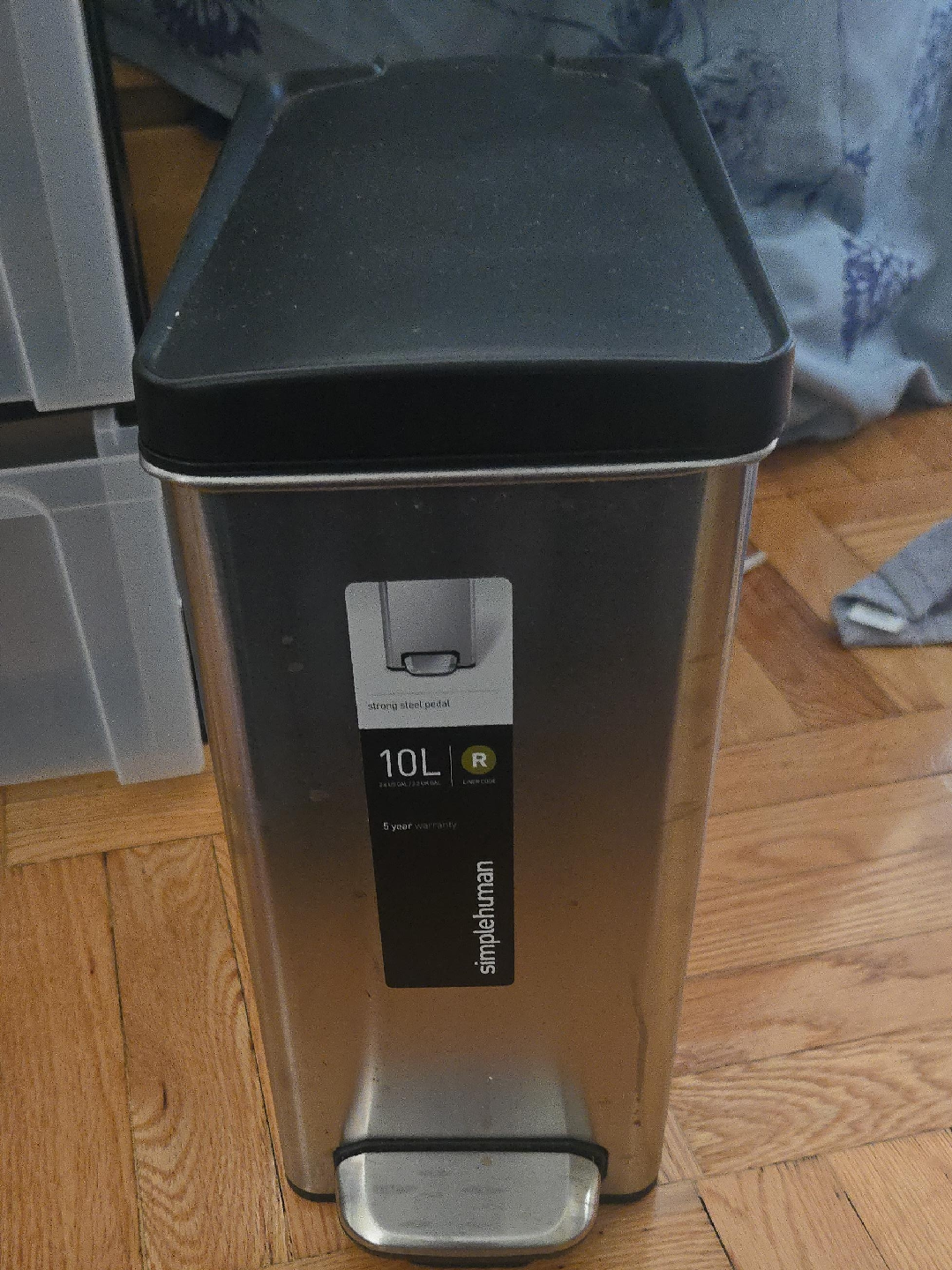 Selling a simplehuman pedal bin with a 10L capacity It features a strong steel pedal and comes with a 5-year warranty