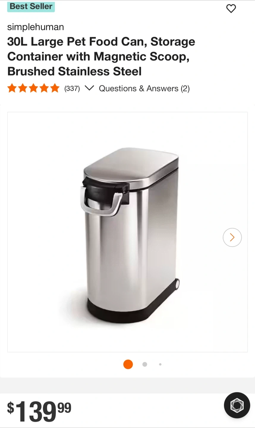 ¡Vendo un contenedor grande de comida para mascotas simplehuman de 30L con una cuchara magnética! Es un contenedor de acero inoxidable . Esta es una excelente manera de mantener la comida de su mascota fresca y organizada.
