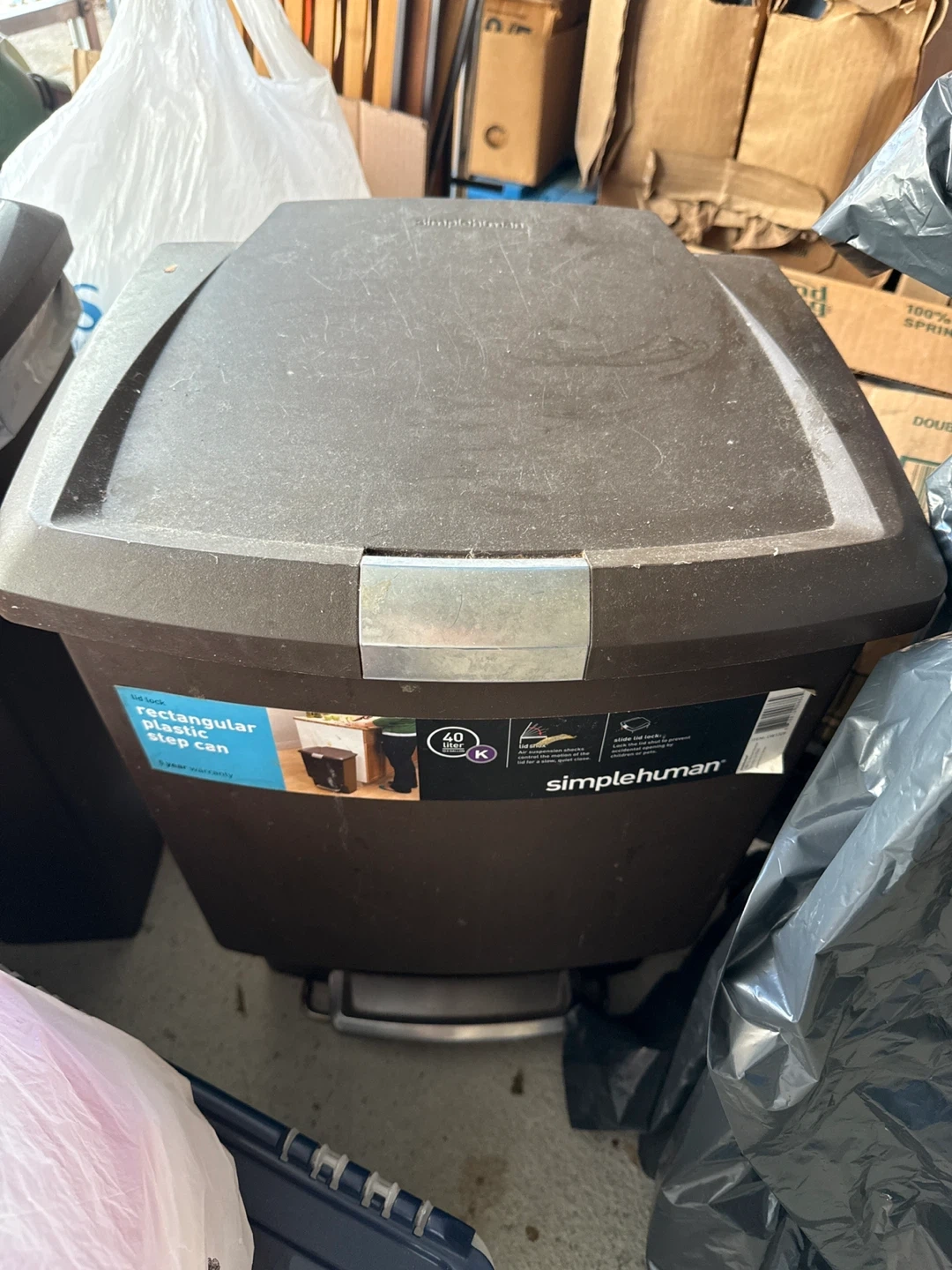 Selling a simplehuman rectangular plastic step can. It has a lid lock and holds 40 liters.