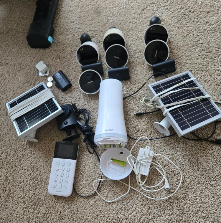 Selling a SimpliSafe home security system. It includes multiple cameras, a base station, a keypad, and solar panels for power. Everything you need to set up a comprehensive security system for your home!
