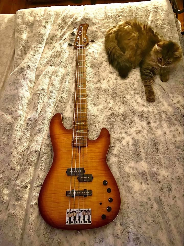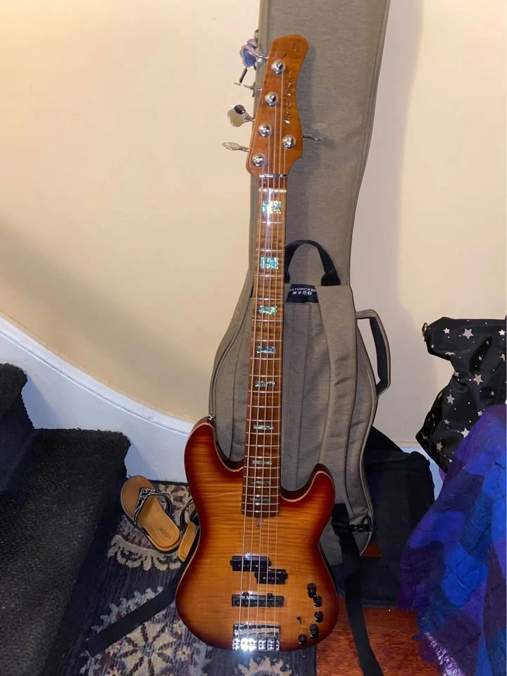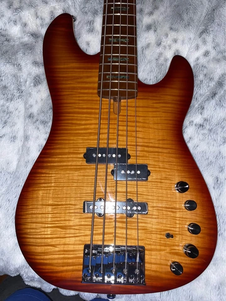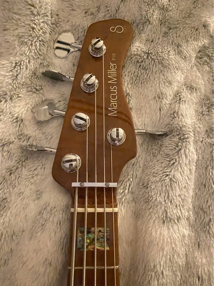 This is the Premium version of the V10. Just as the V10 is the higher version of the V7, the P10 is similarly a higher version of the P7. USED only 3 times in home, and is LIKE NEW. The reason I am parting with it: As a working bassist (35 years), this bass was my first online instrument purchase ever, and despite the amazing craftsmanship Sire performed on an instrument in this price range, the "feel" of it was simply not for me. This is a wonderful Bass and I'm very disappointed it didn't meet my expectations. If you like a jazz bass "feel" in the plucking hand, then this is right up your alley and you will not be disappointed. SPECS: Body Material: Alder + Solid Maple Top + Flamed Veneer Body Shape: Sire Precision Bass Type Neck Material: 1 Piece Hard Maple(Roasted Maple Neck / Satin Finish) Neck Shape: C-Shape Scale: 34” Neck Joint: 4 Bolt Steel Square Plate Fingerboard: Flame Maple(Rolled Edges) Fingerboard Radius: 9.5″ Frets: 2.4 medium String Nut: Natural Bone 46mm width Inlay: Abalone Block Pickups: Marcus Premium-J Revolution Set Electronics: Marcus Heritage-3 with Middle Frequency Control Controls: Volume / Tone(Dual Pot) | Pickup Blender | Treble | Middle / Middle Frequency(Dual Pot) | Bass, Mini Toggle(Active / Passive) Knobs: Modern Black Aluminum Bridge: Marcus Miller Heavy Mass Standard Tuning Gear: Premium Open-Gear Hardware Finish: Chrome Pick guard: Transparent Pickguard