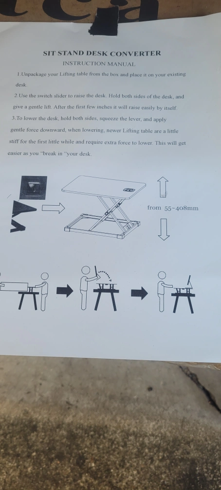 Sit stand desk converter. It explains how to unpack the lifting table, raise the desk using the switch slider, and lower the desk by squeezing the lever. The height is adjustable from 55mm to 408mm