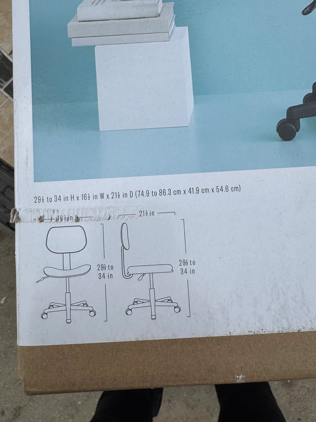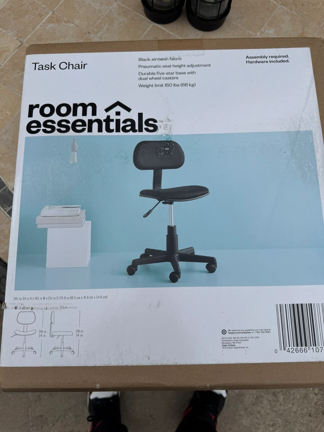 This black airmesh fabric task chair has pneumatic seat height adjustment and a durable five-star base with swivel casters. It has a weight limit of 150 lbs (68 kg). Assembly required; hardware included.