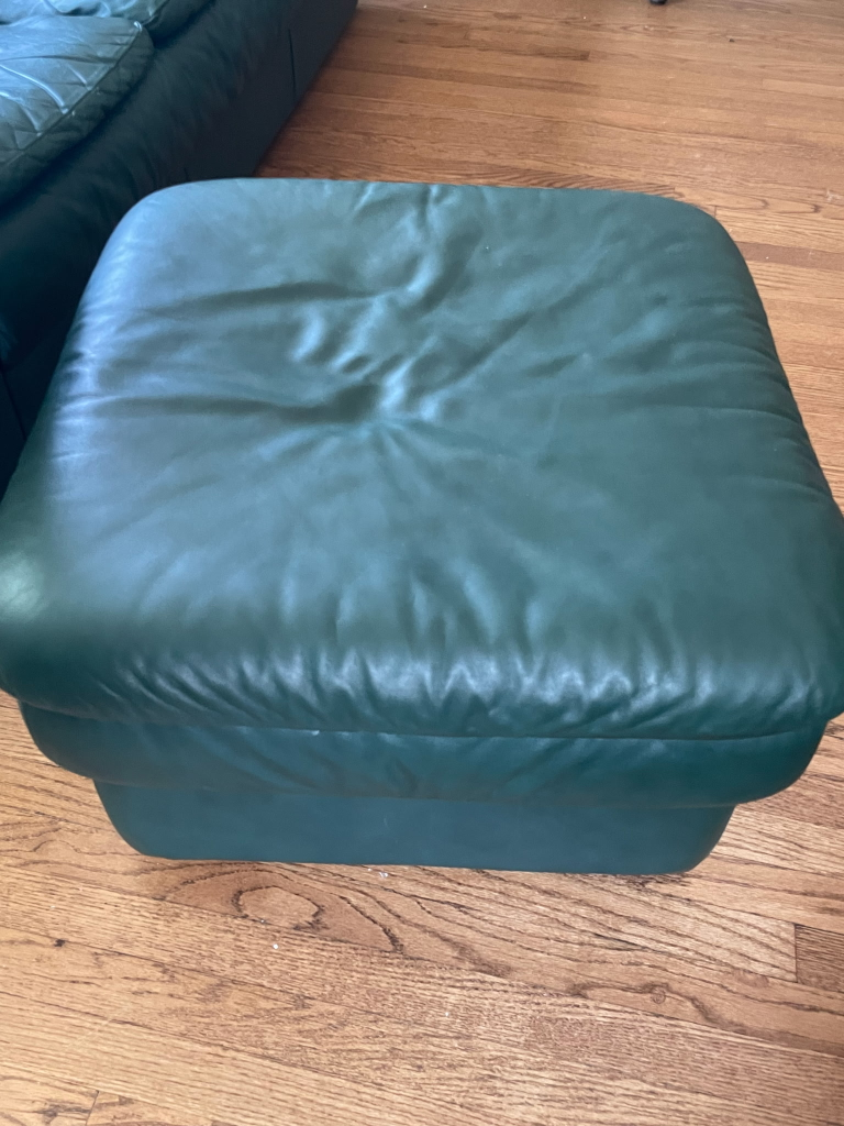 Selling a comfortable green leather ottoman. It's in good condition and would be a great addition to any living room or seating area!