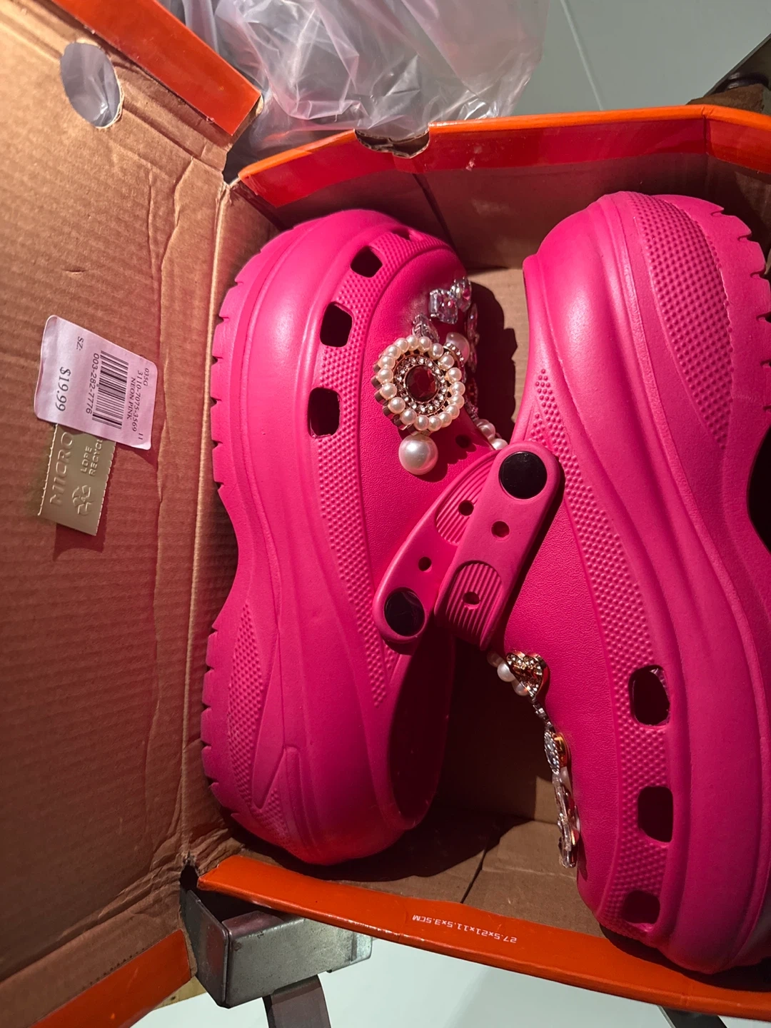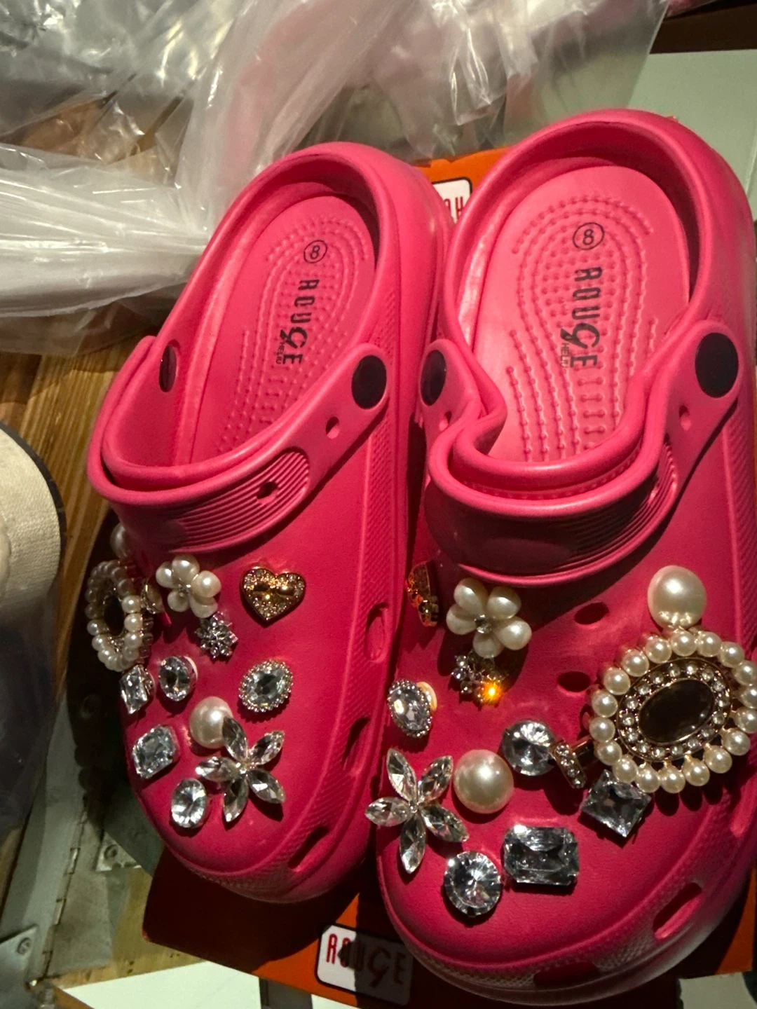 67These are a pair of pink Rouge clogs in women's size 8. They have been decorated with various pearl and rhinestone embellishments. They come with the box!