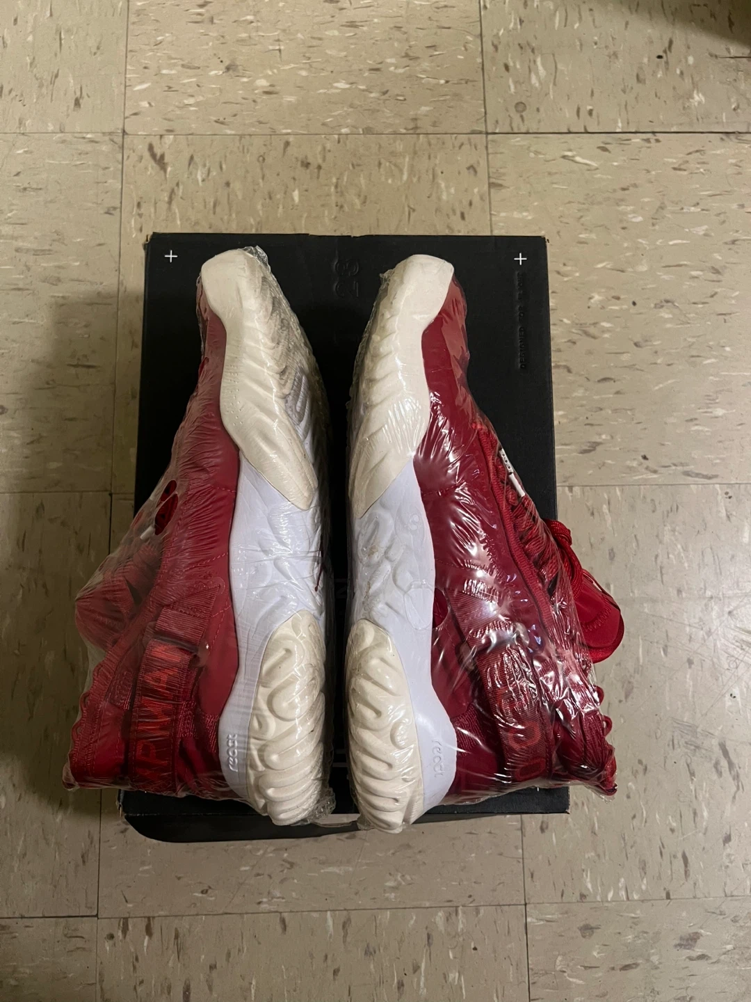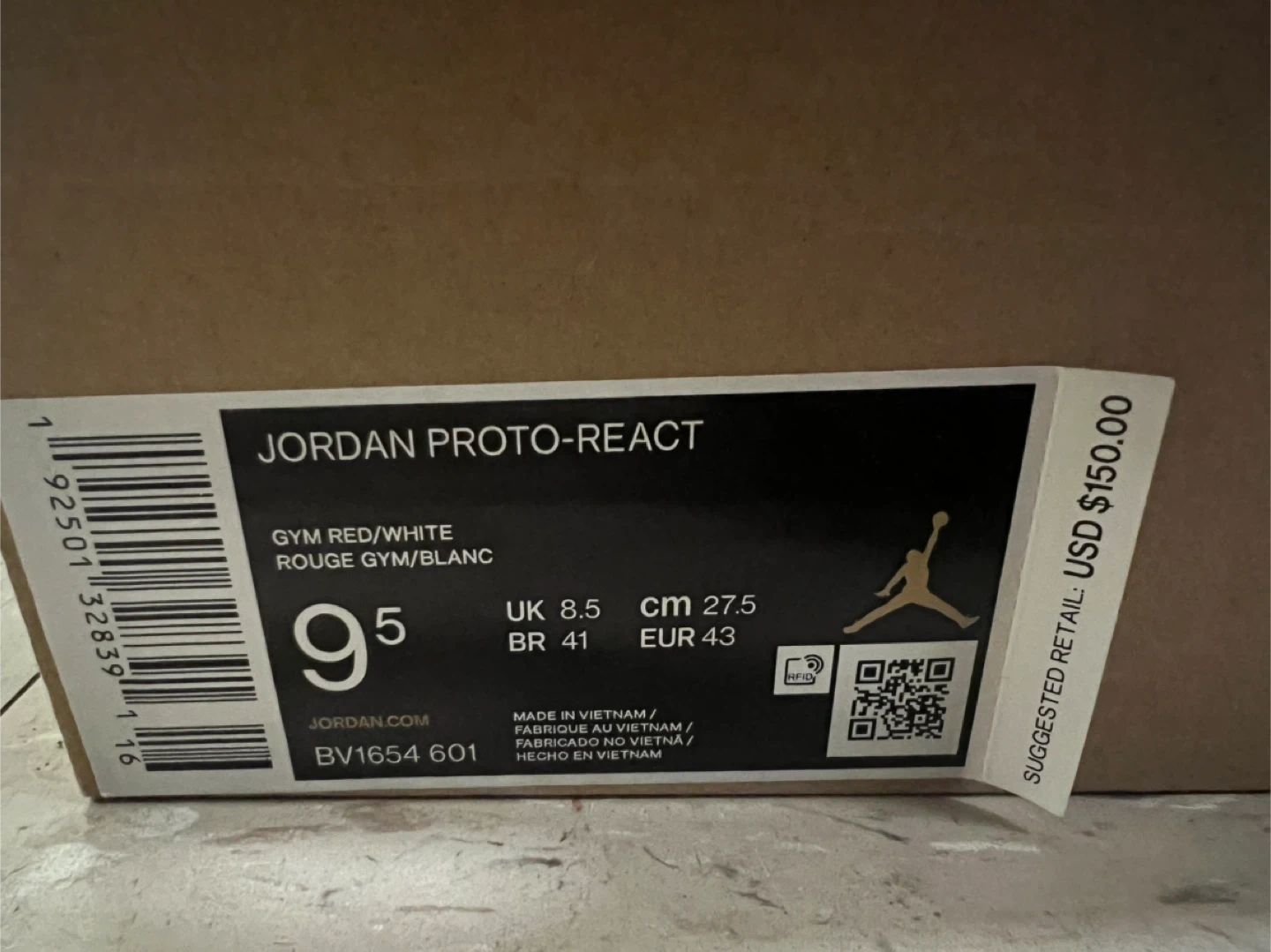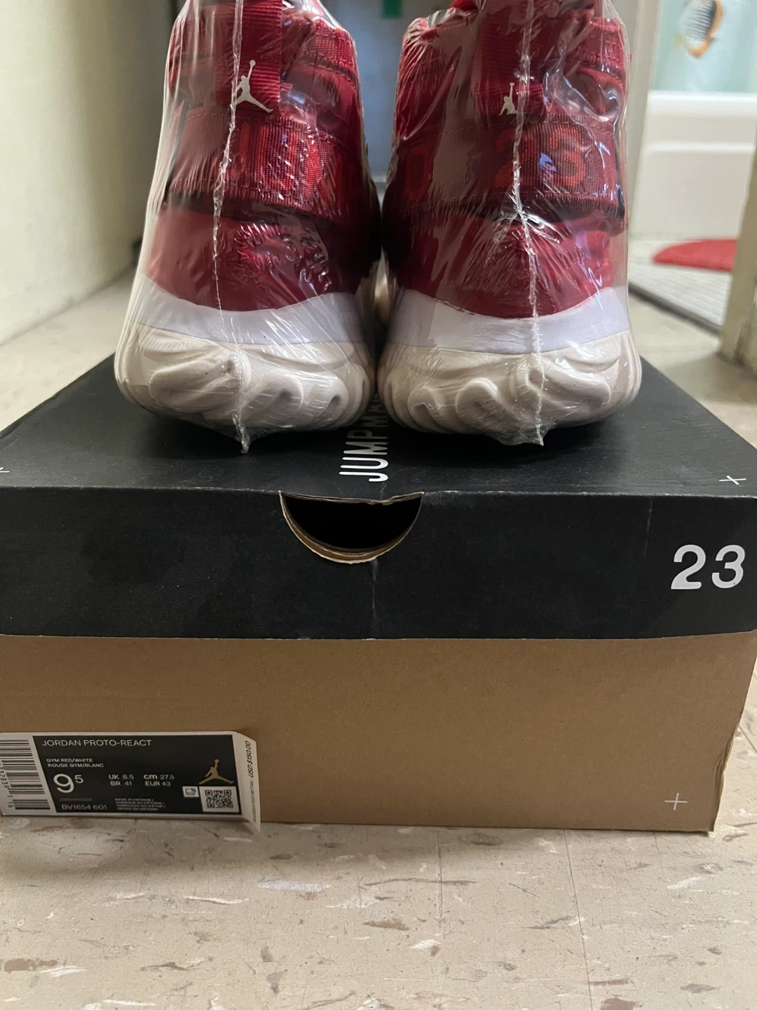 145Size 9.5 pre-owned pair of red and white Jordan Proto Reacts My ex plastic wrapped em for some reason Please message before buying