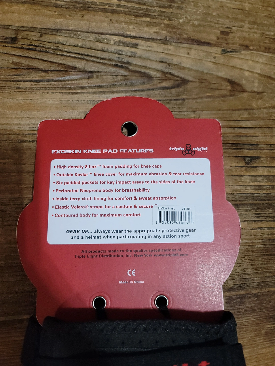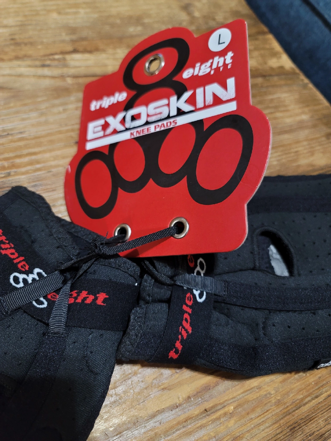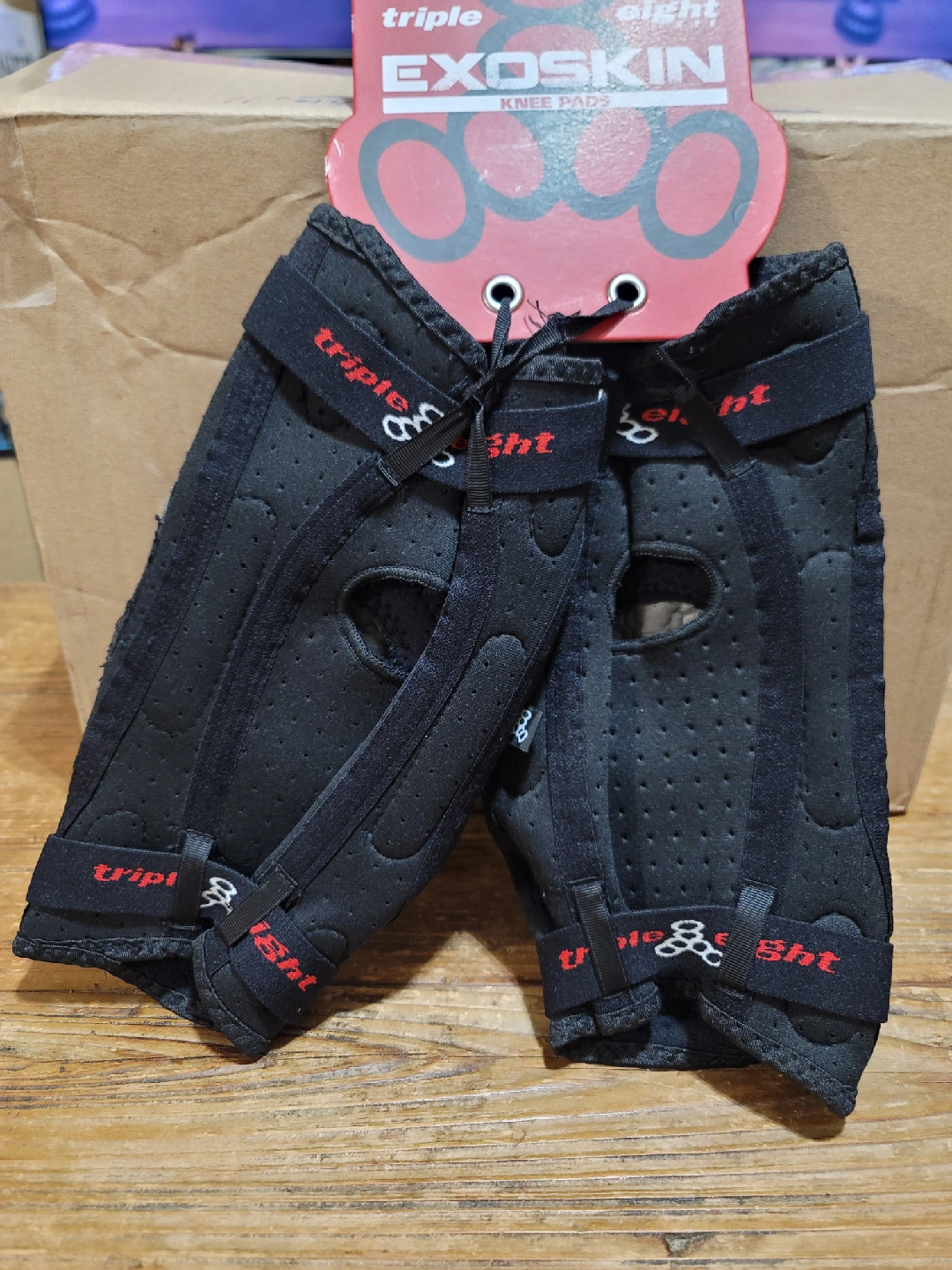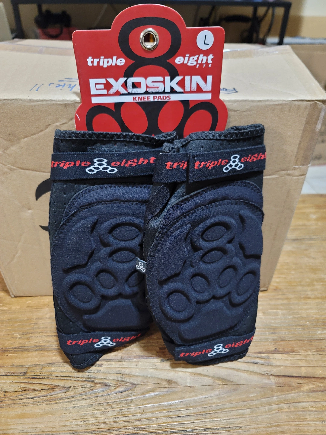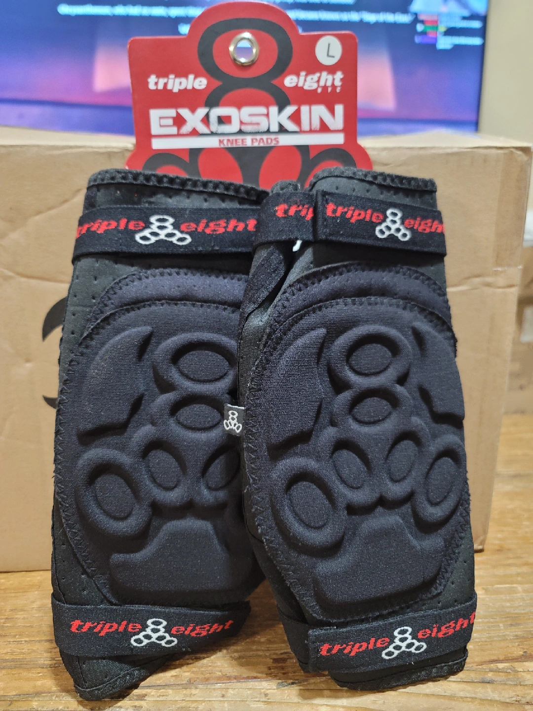 New. Triple Eight ExoSkin Knee Pads in size L! These knee pads are designed for maximum comfort and protection. They feature: - High density 8-link™ foam padding for knee caps - Exterior Kevlar® cover for maximum abrasion & tear resistance - Six padded pockets for key impact areas to the sides of the knee - Perforated Neoprene body for breathability - Interior terry cloth lining for comfort & sweat absorption - Velcro® straps make for a custom fit - Contoured body for maximum comfort Ideal for Mountain Biking; BMX; Skateboarding; Snowboarding Feel free to reach out with any questions! Accept Cash Only.