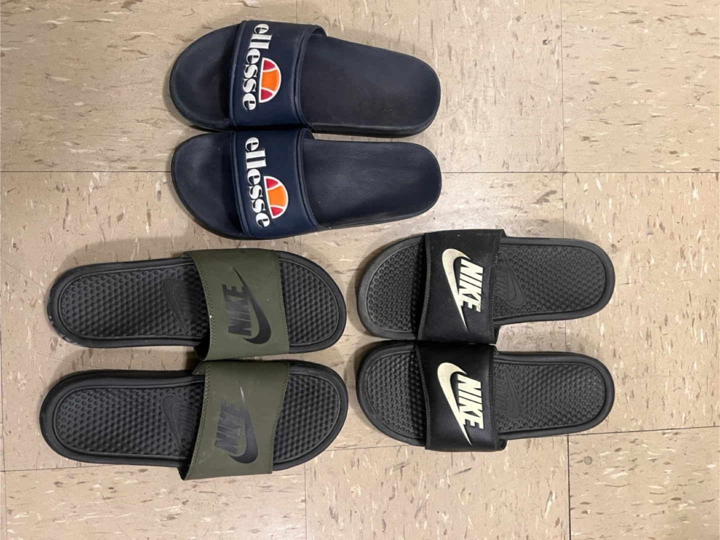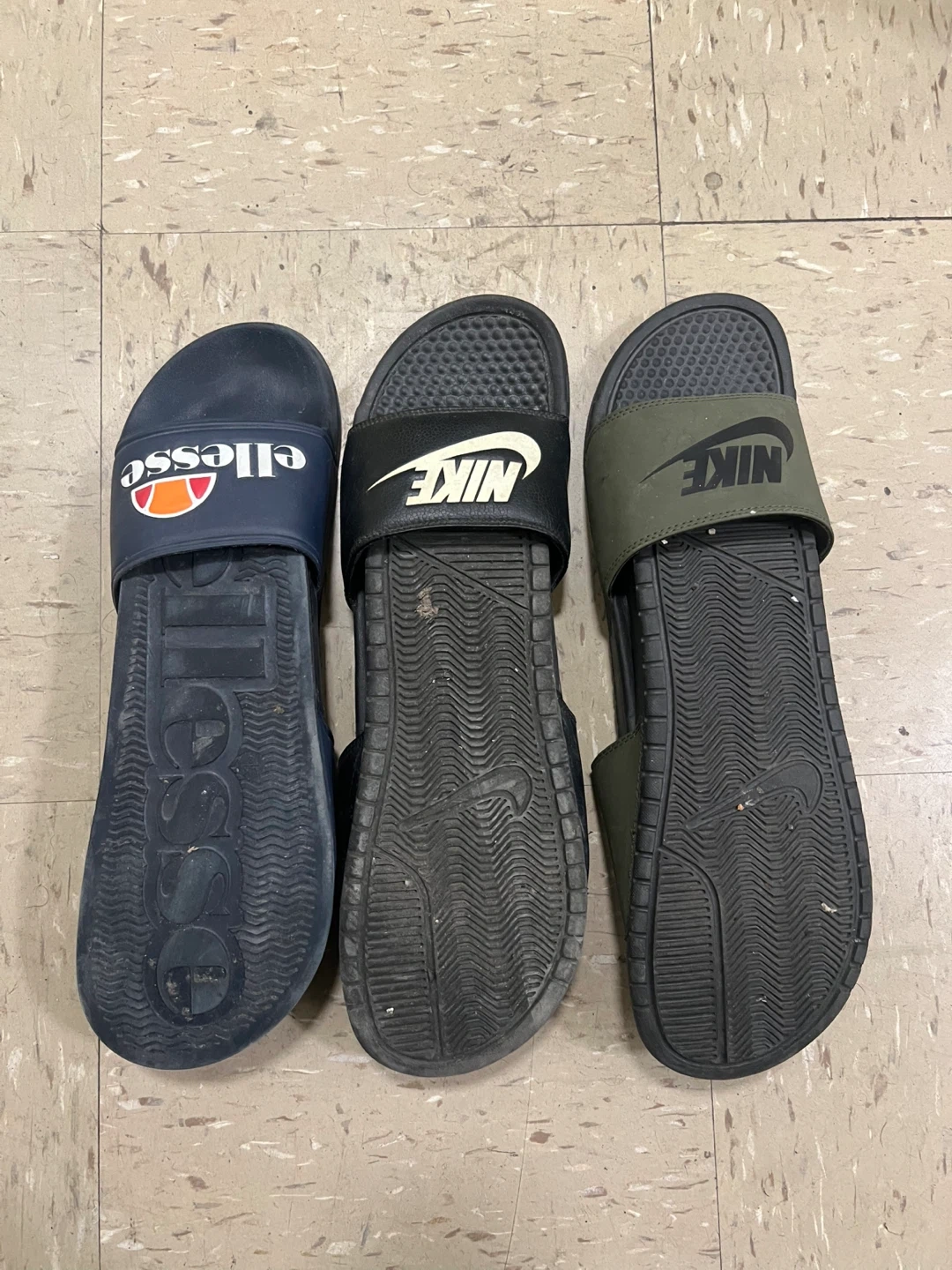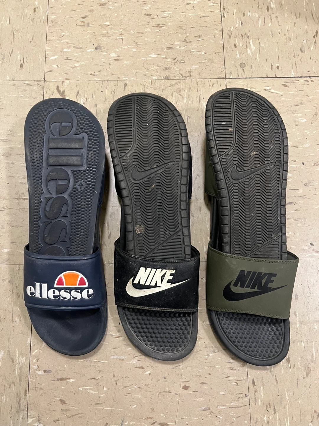 183Pre-owned pairs of slides. $5 for 1, $12 for all. Each is in okay condition, but the Ellesse slides are in the best shape Ellesses - 8M Black Nikes - 9M Green Nikes - 10M Please message before buying