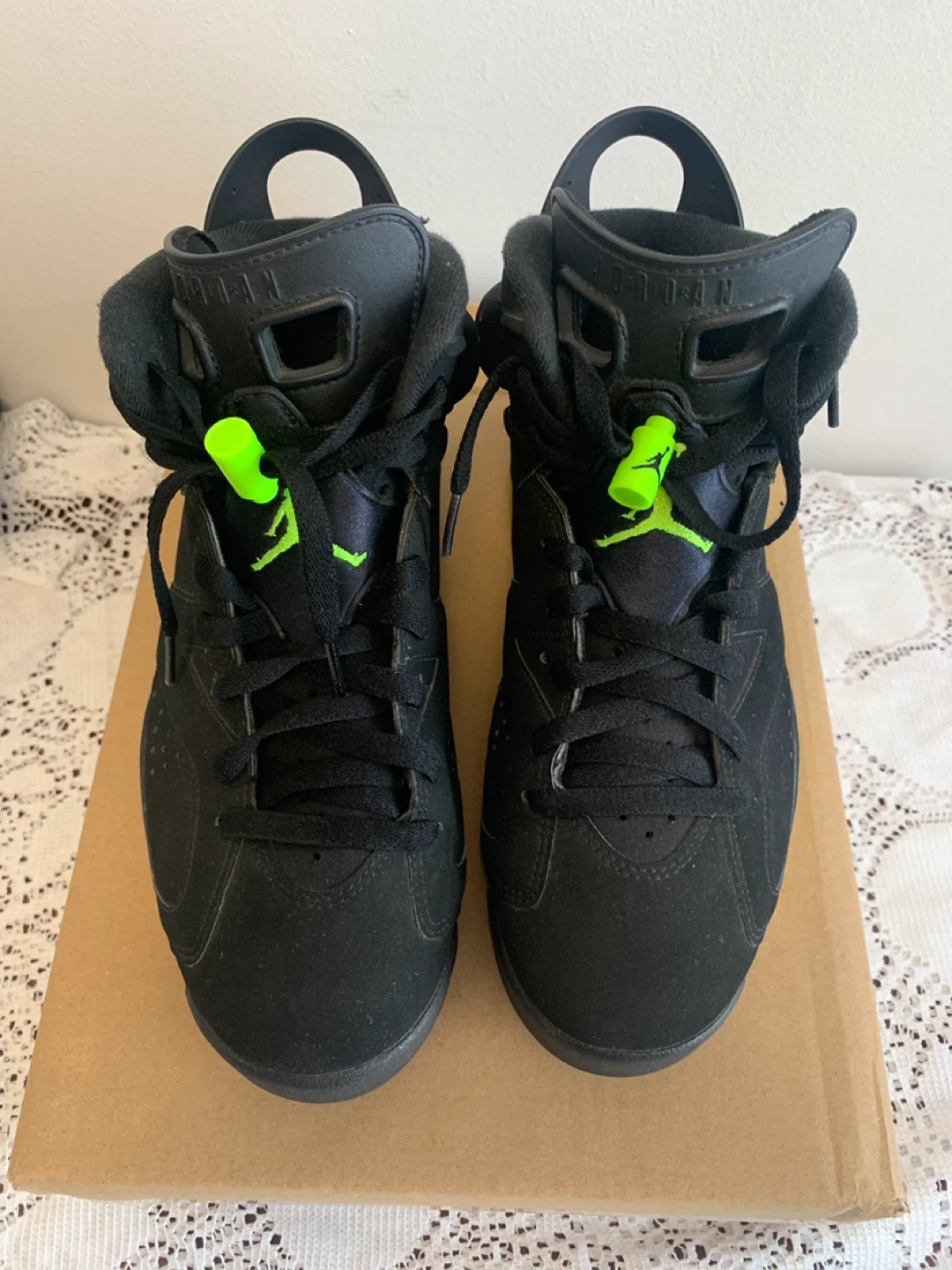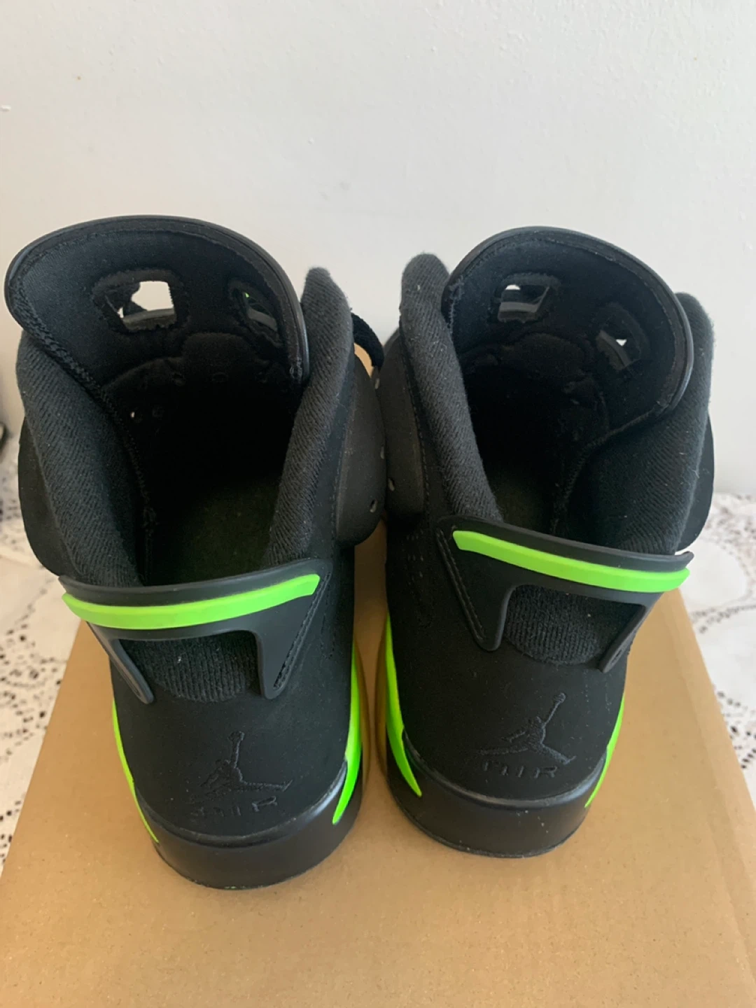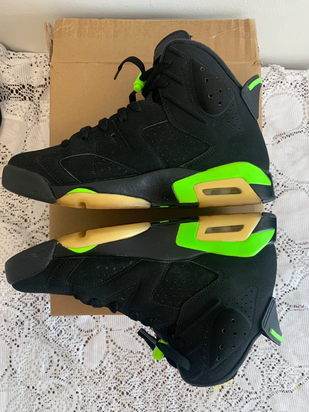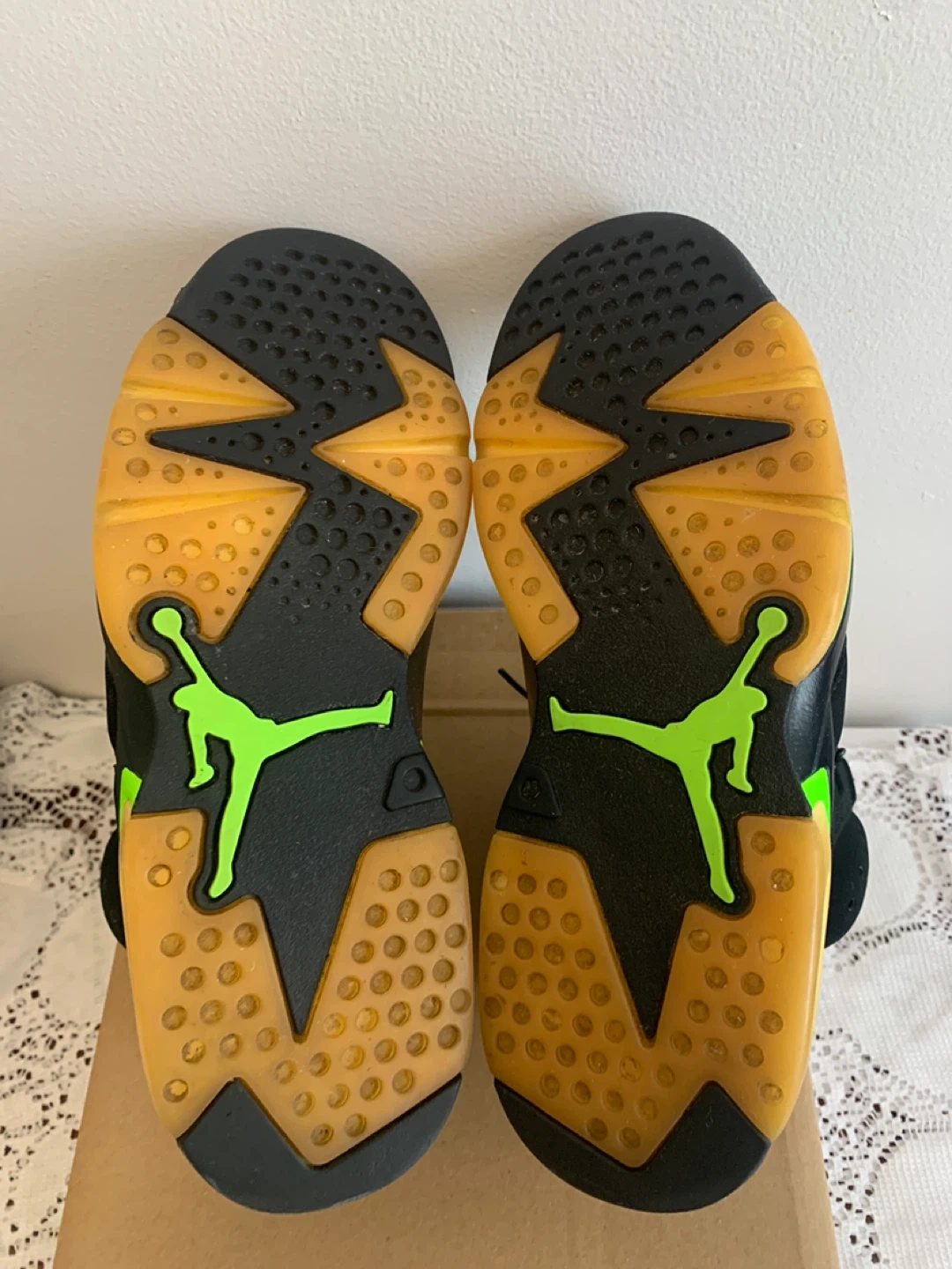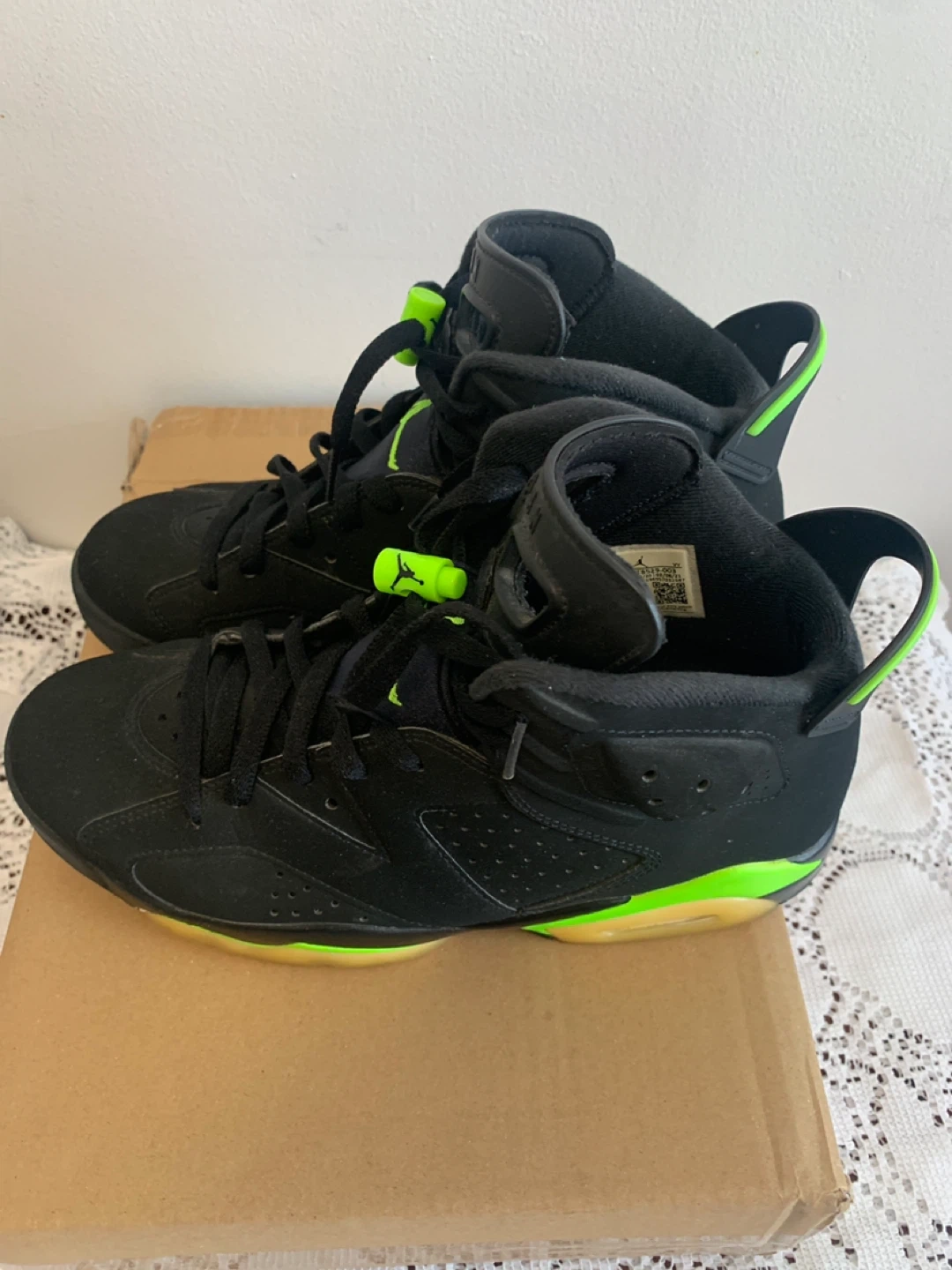 Black and neon green Air Jordan 6 Retro sneakers. Lace-up closure. Rubber sole.