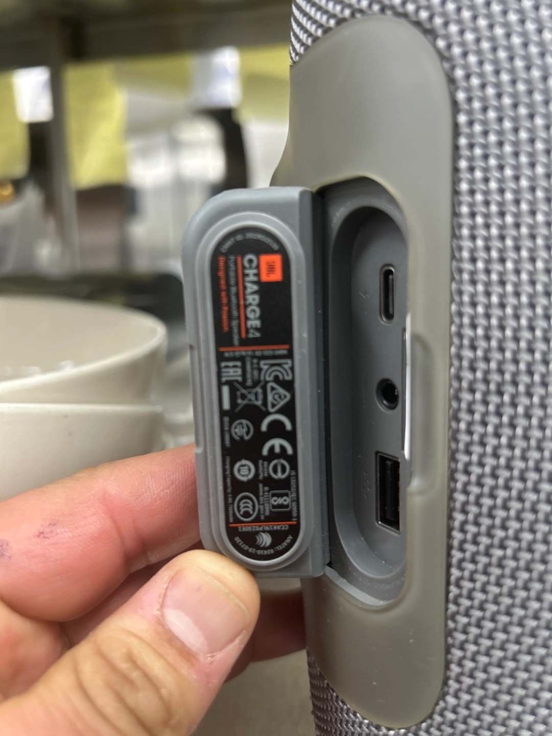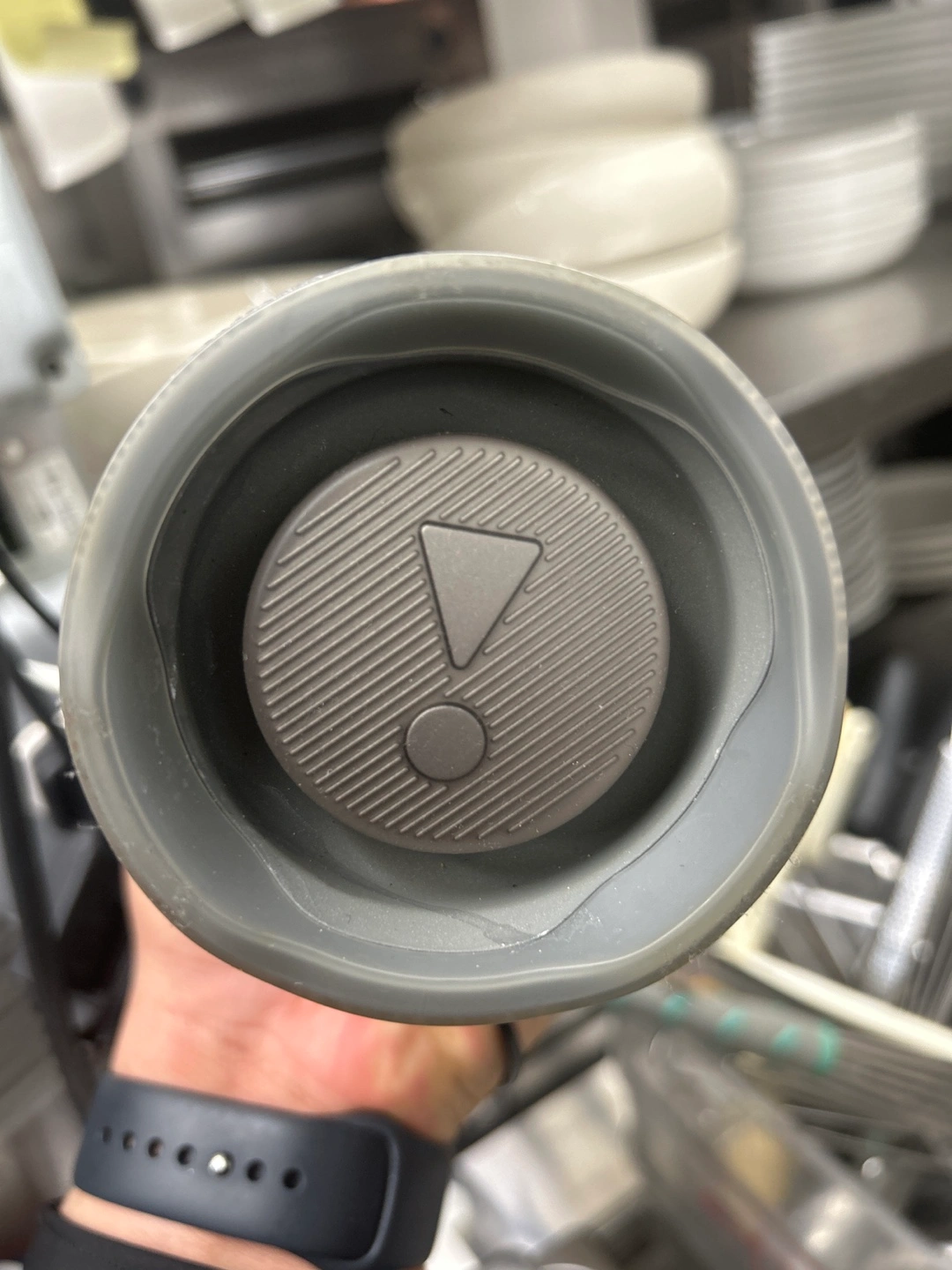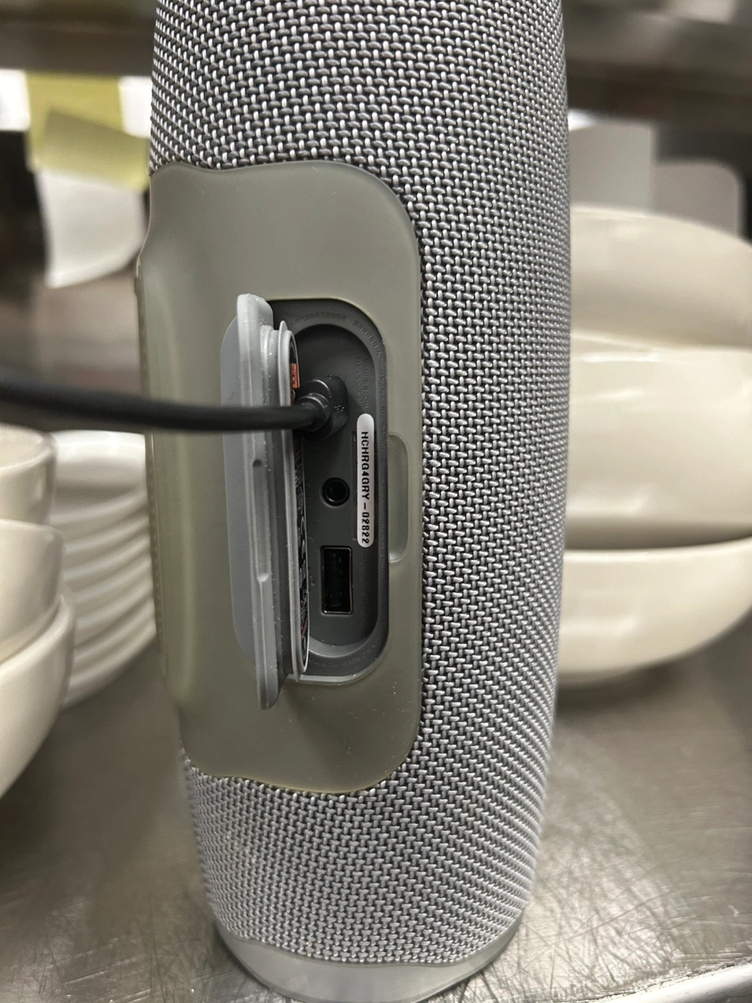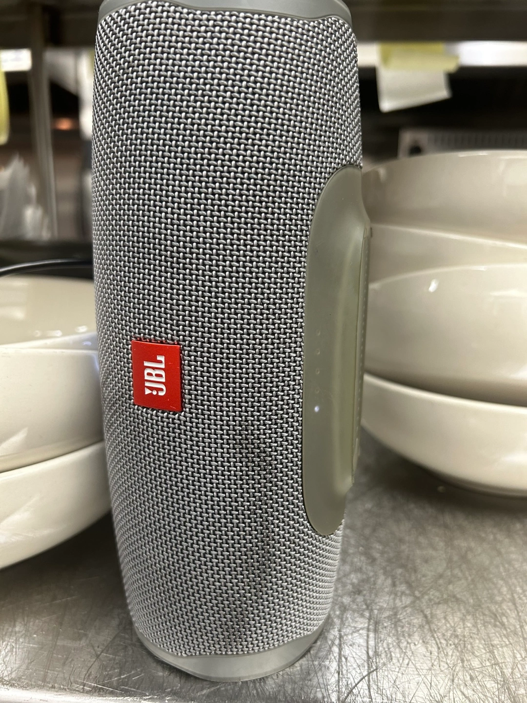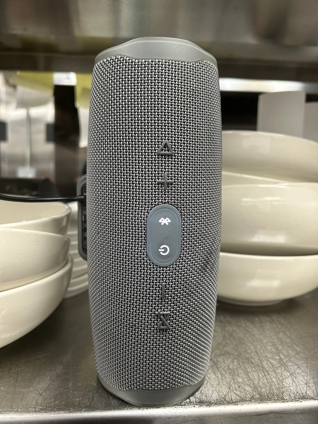 Portable Bluetooth speaker. Great sound quality. Long battery life. Compact and easy to carry. Slightly used.