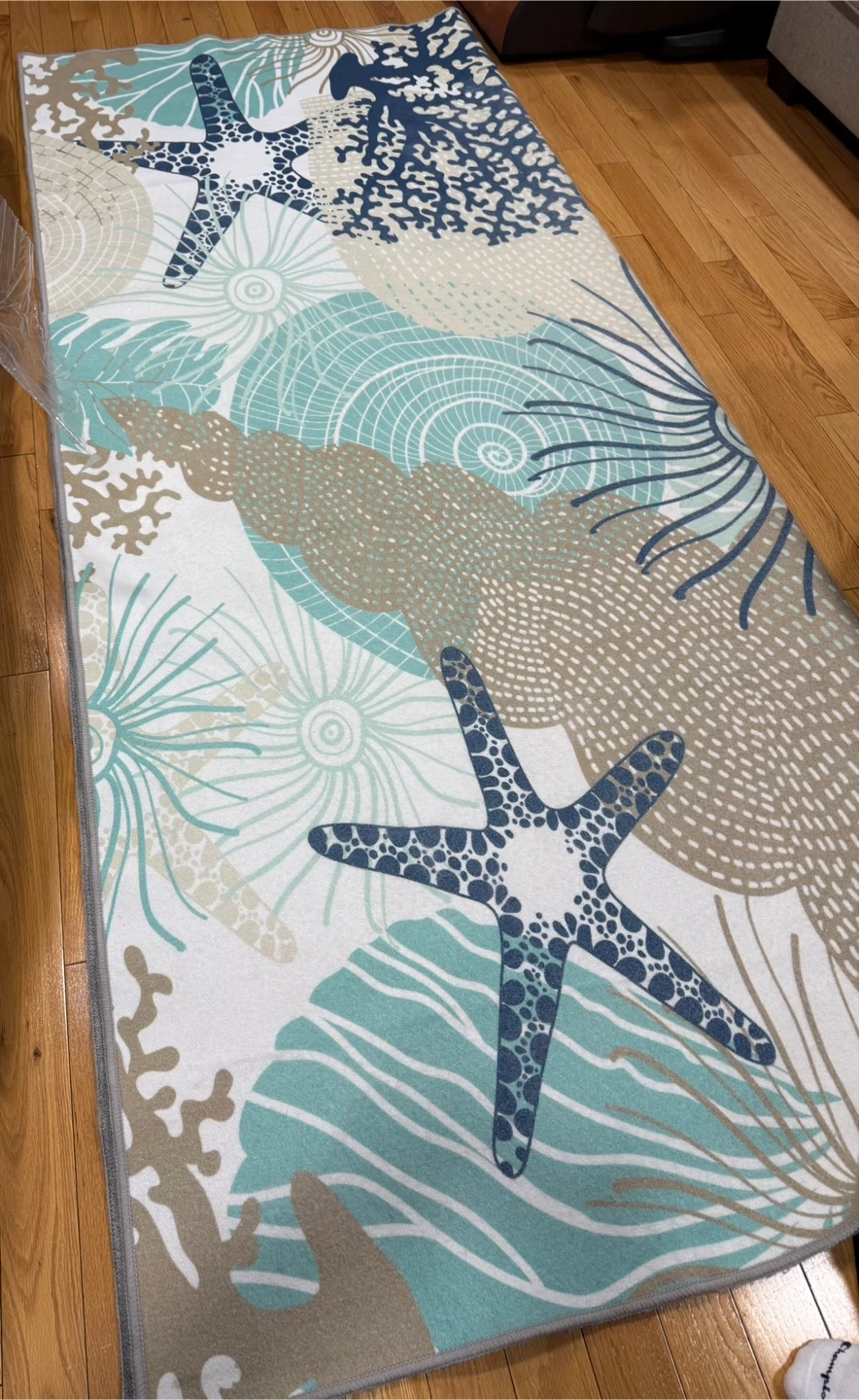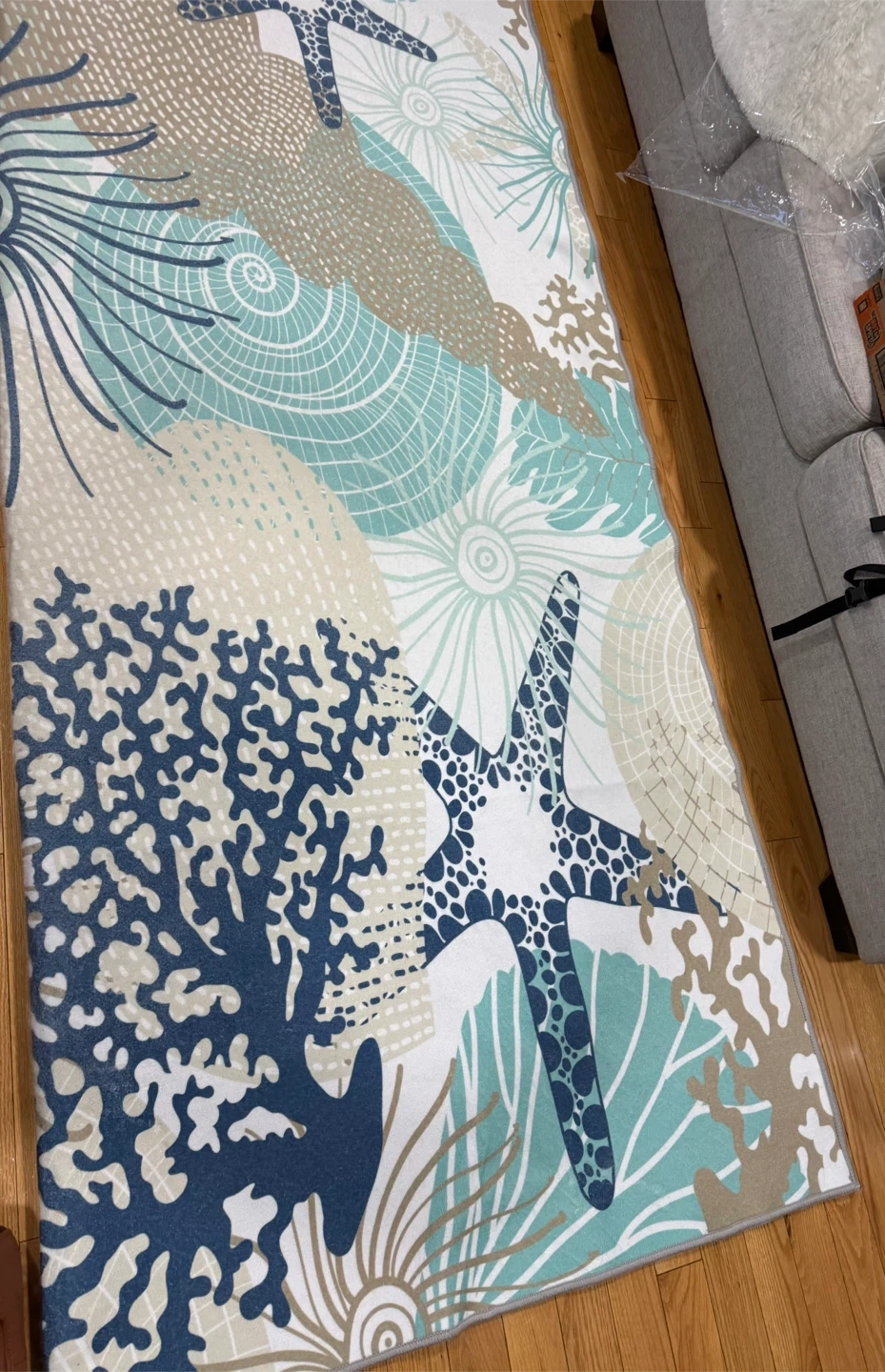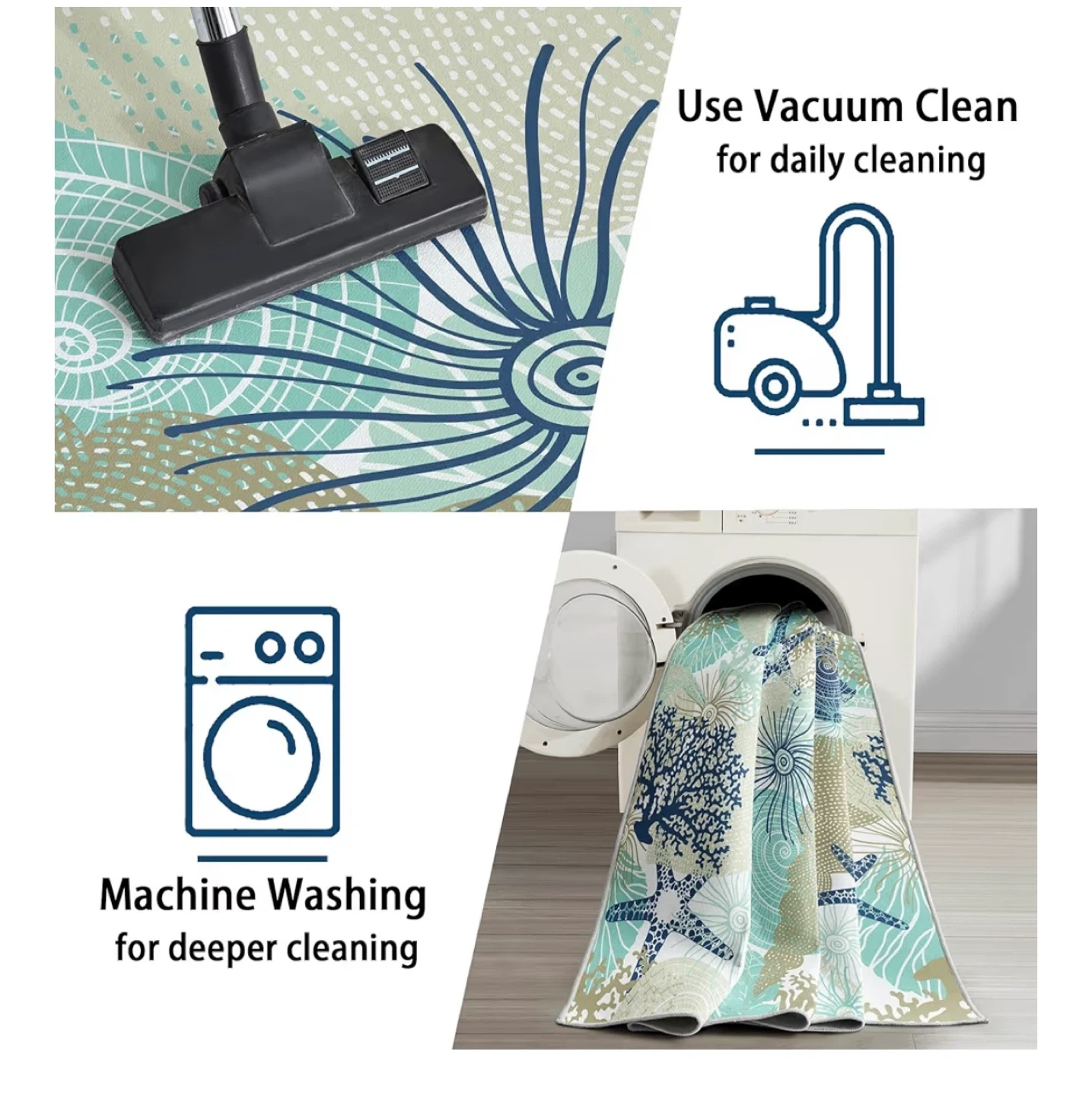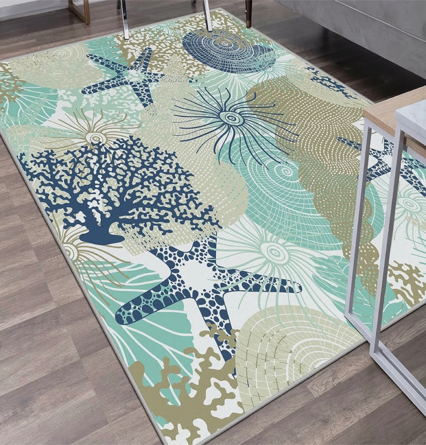 Add a touch of the ocean to your home with this coastal-style area rug! It features a beautiful sea life design with starfish, coral, and other marine elements in shades of blue, green, and beige. This rug is perfect for adding a pop of color and a relaxed vibe to any room. It's also easy to clean with a vacuum or in the washing machine!