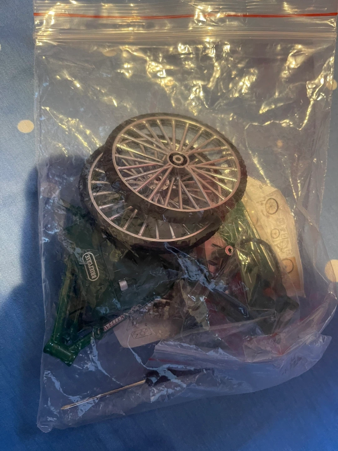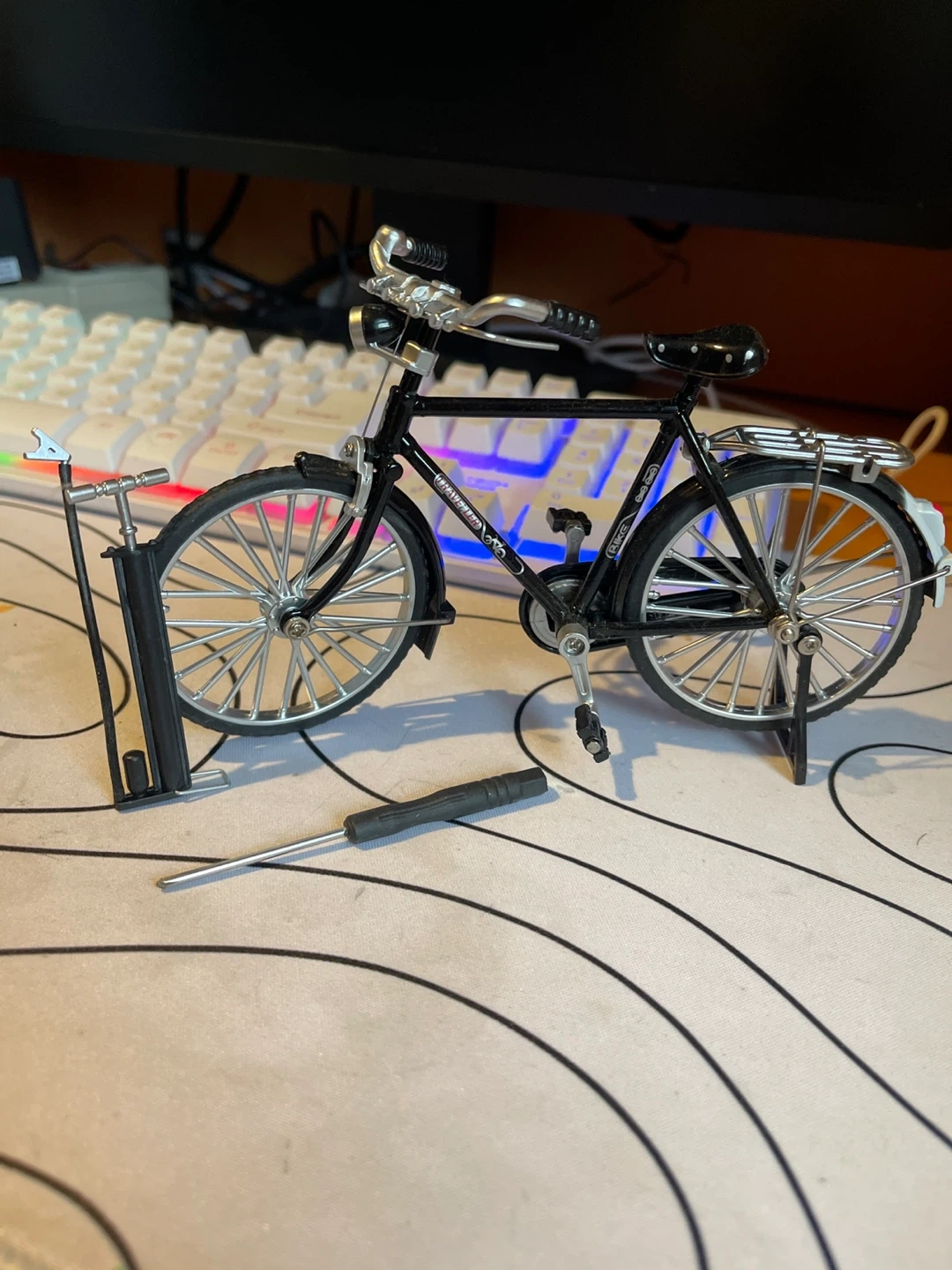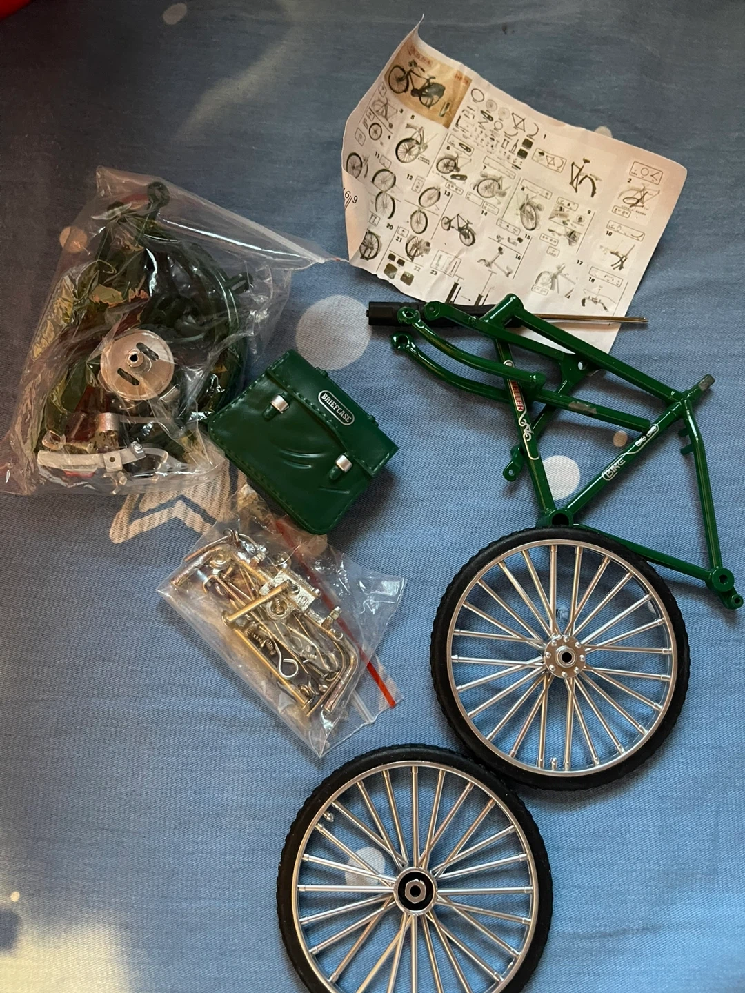 This is a model bicycle set. It includes the bicycle, a pump, a screwdriver, and a small green bag accessory. All parts appear to be present. This is a collectible item for display.