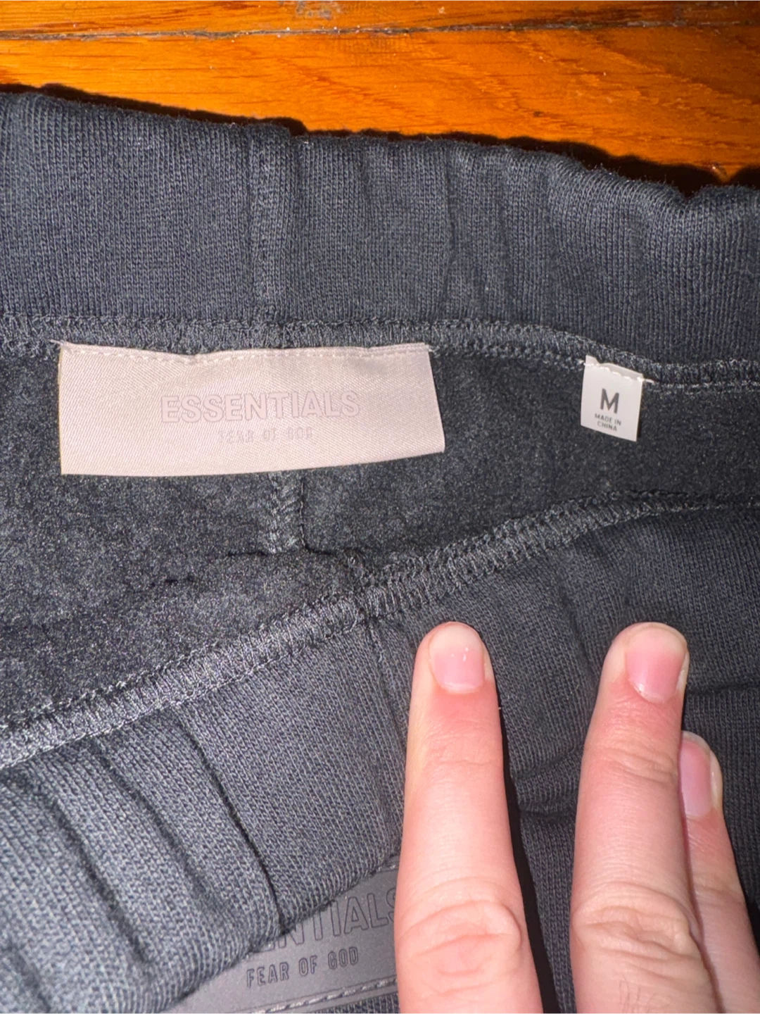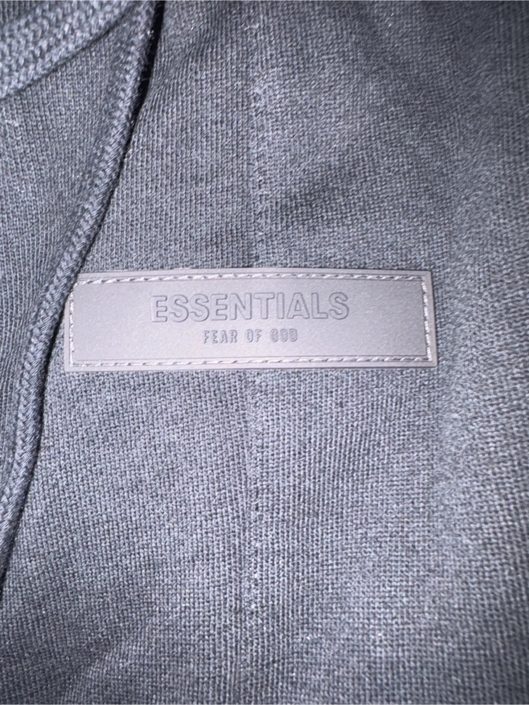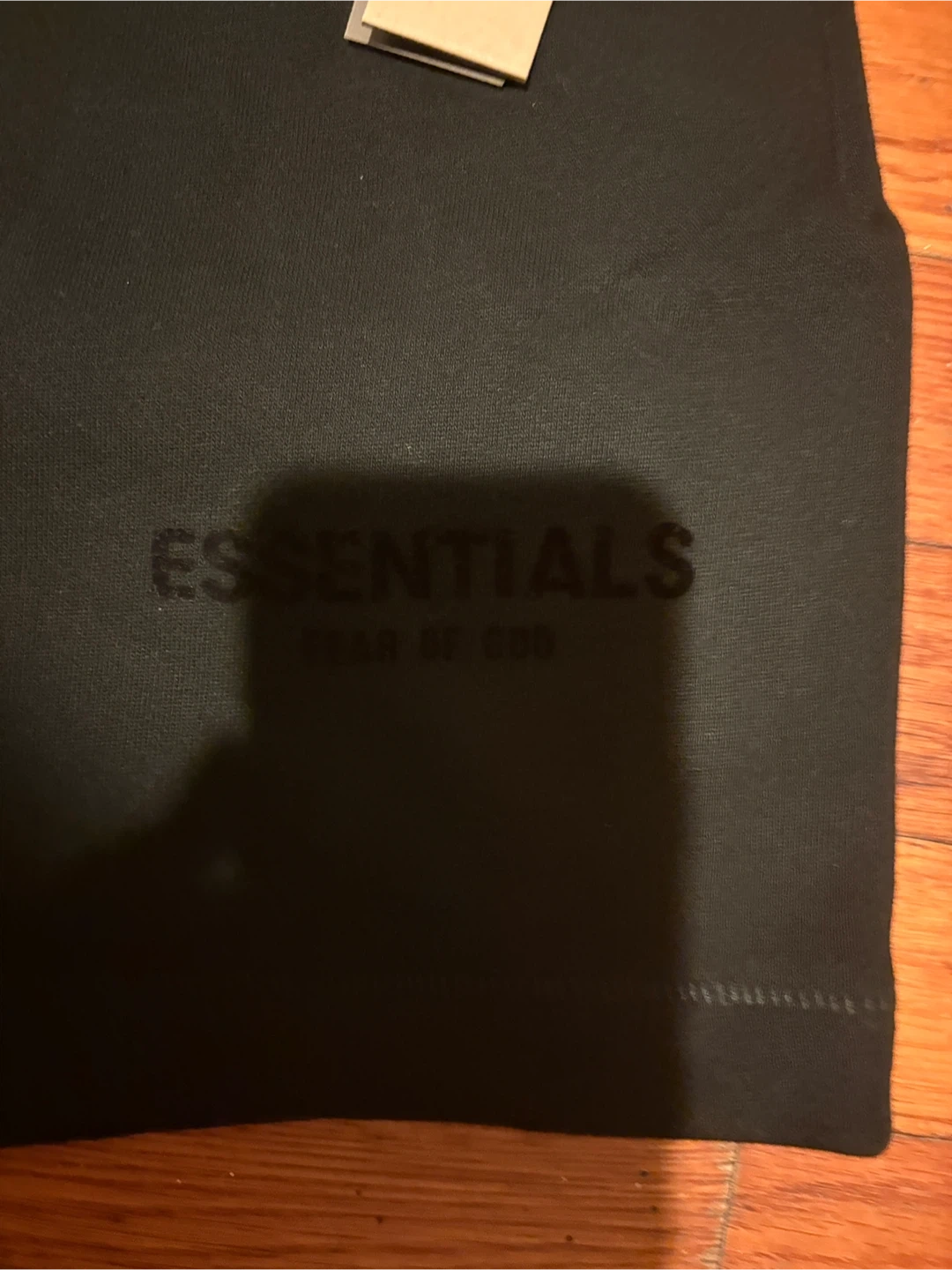These are Fear of God Essentials sweat shorts. They're made of 80% cotton and 20% polyester. They feature an elastic waistband with a drawstring and a logo patch on the back pocket.