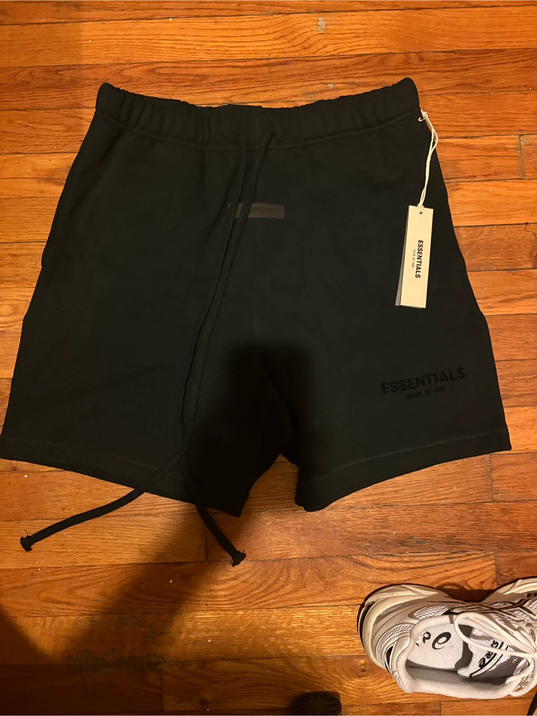 These are Fear of God Essentials sweat shorts. They're made of 80% cotton and 20% polyester. They feature an elastic waistband with a drawstring and a logo patch on the back pocket.