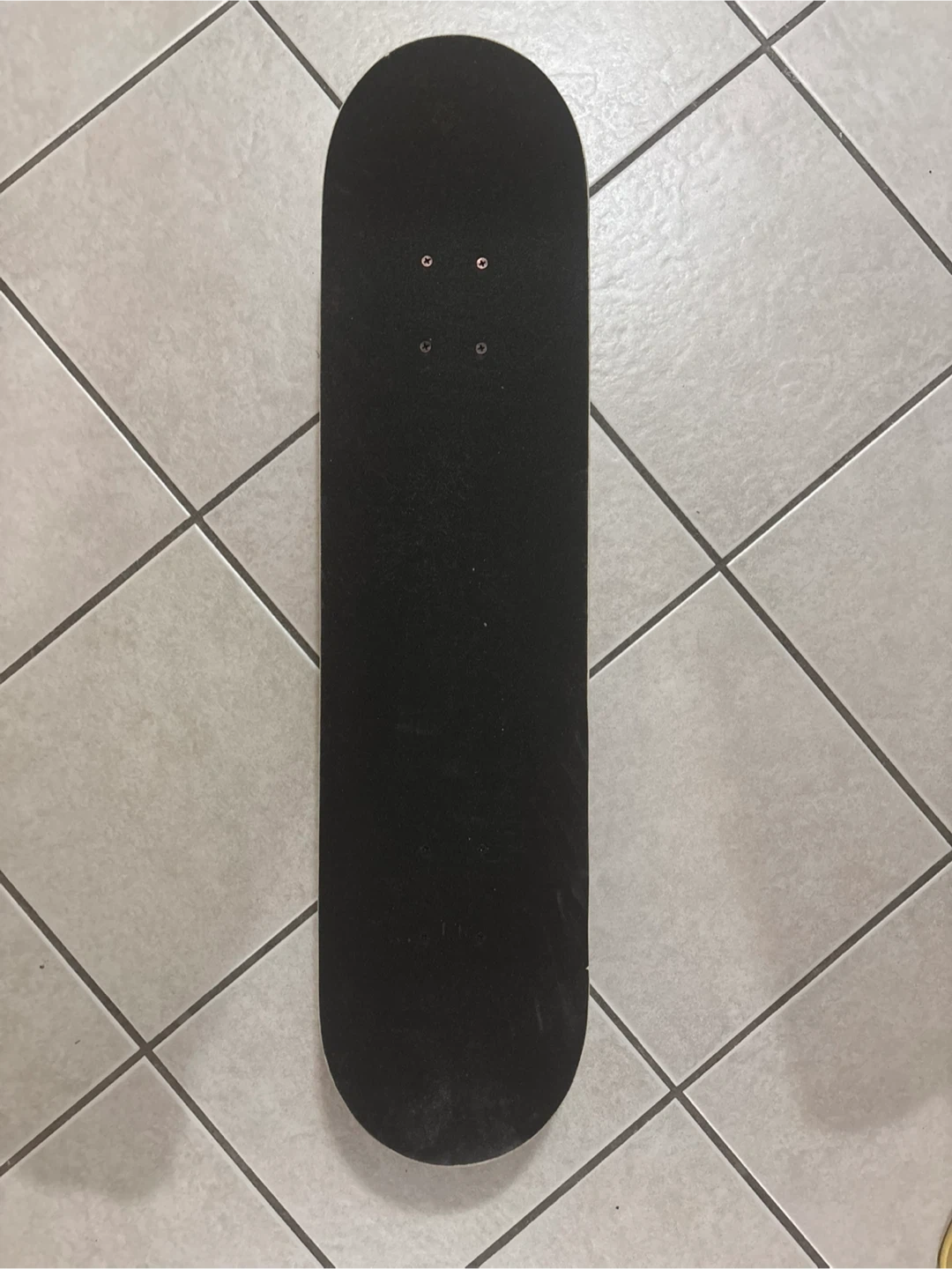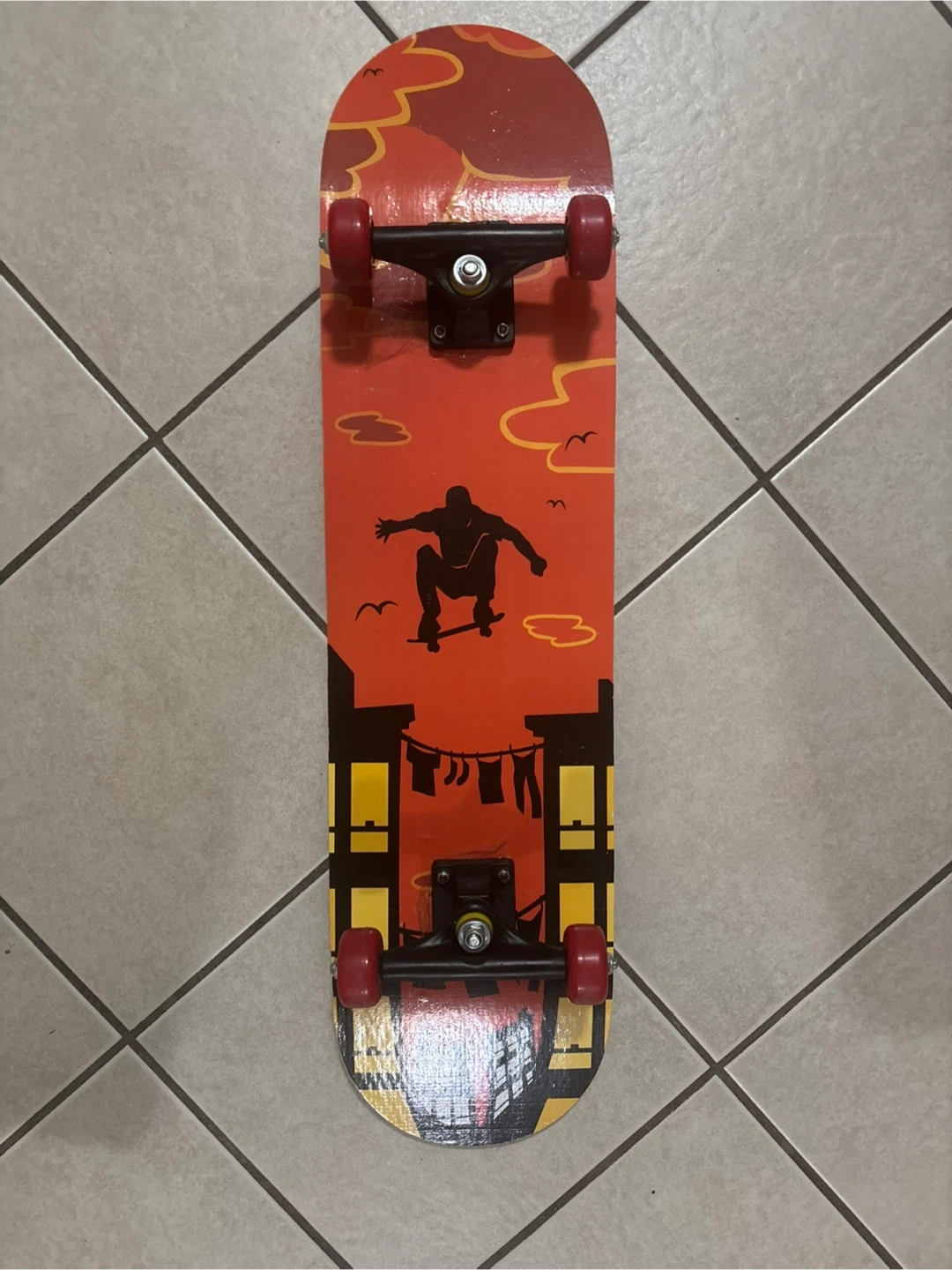 10Selling a skateboard with a cool urban design on the deck! It features a silhouette of a skater against a sunset-like sky, with buildings and clotheslines below. The wheels are red, and the grip tape is black.