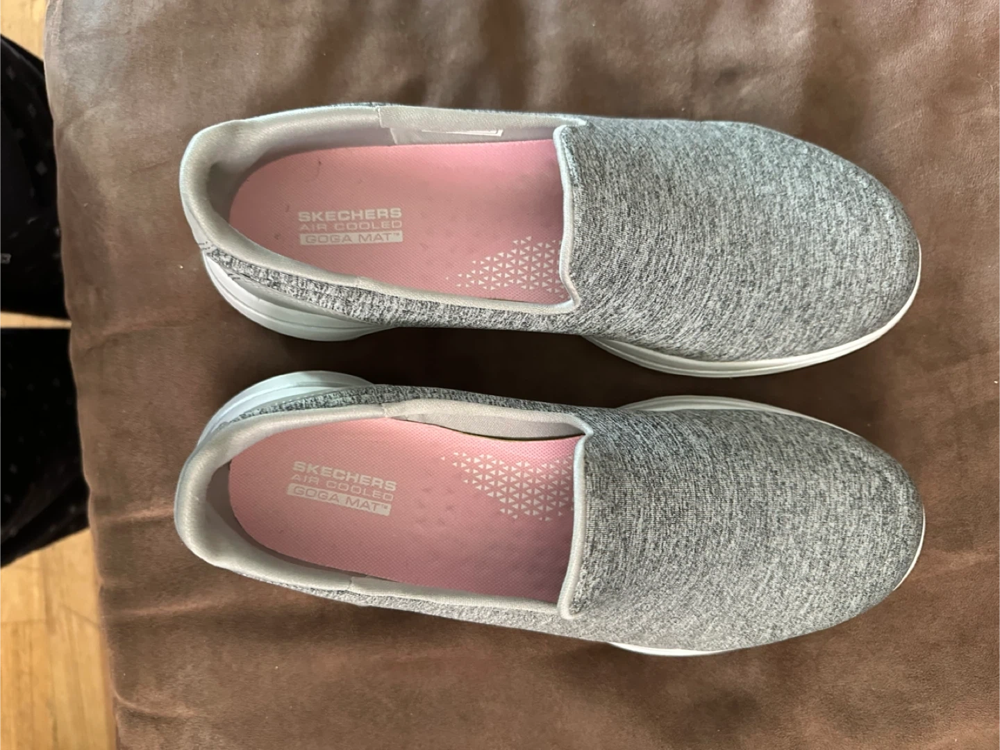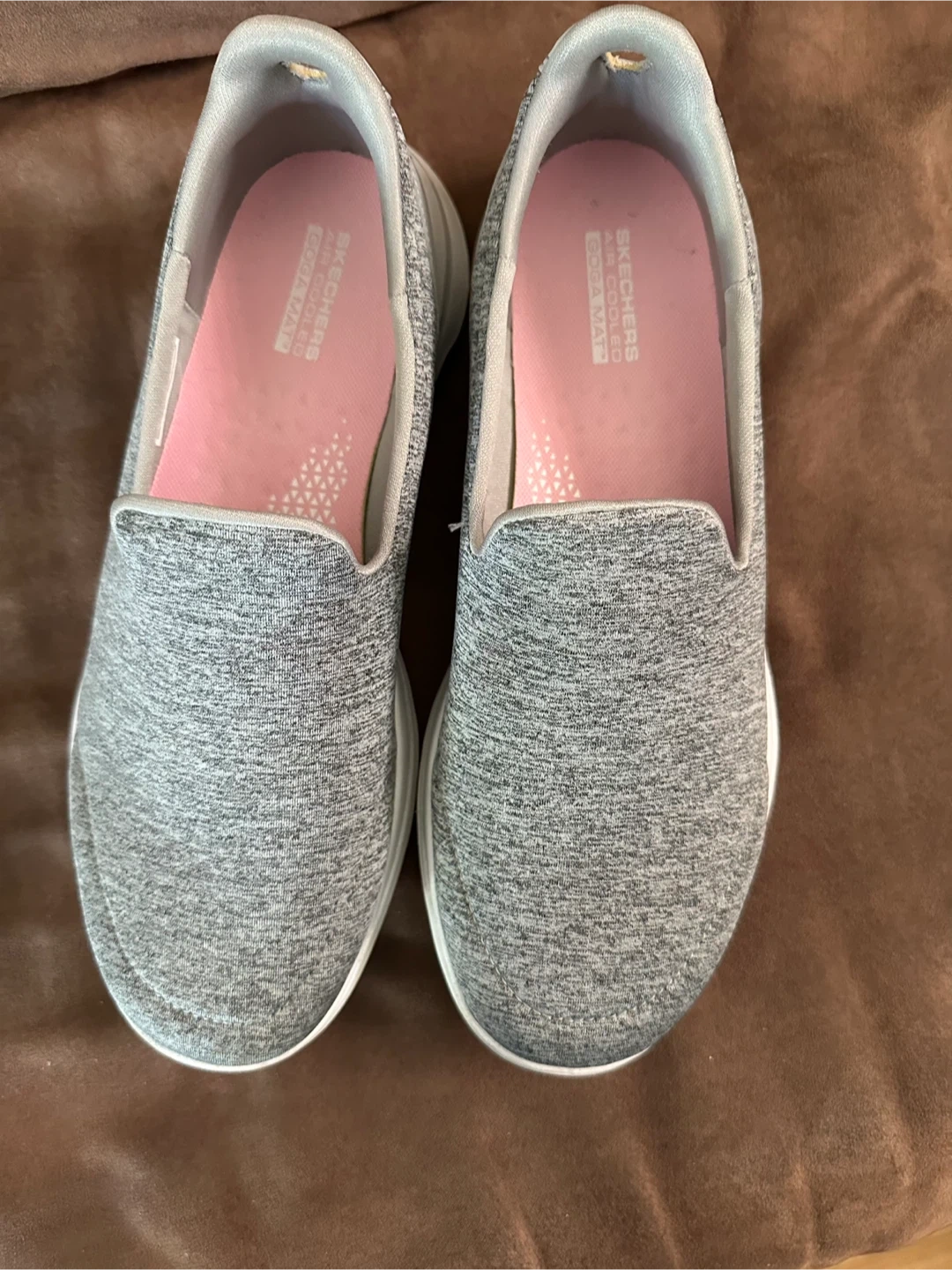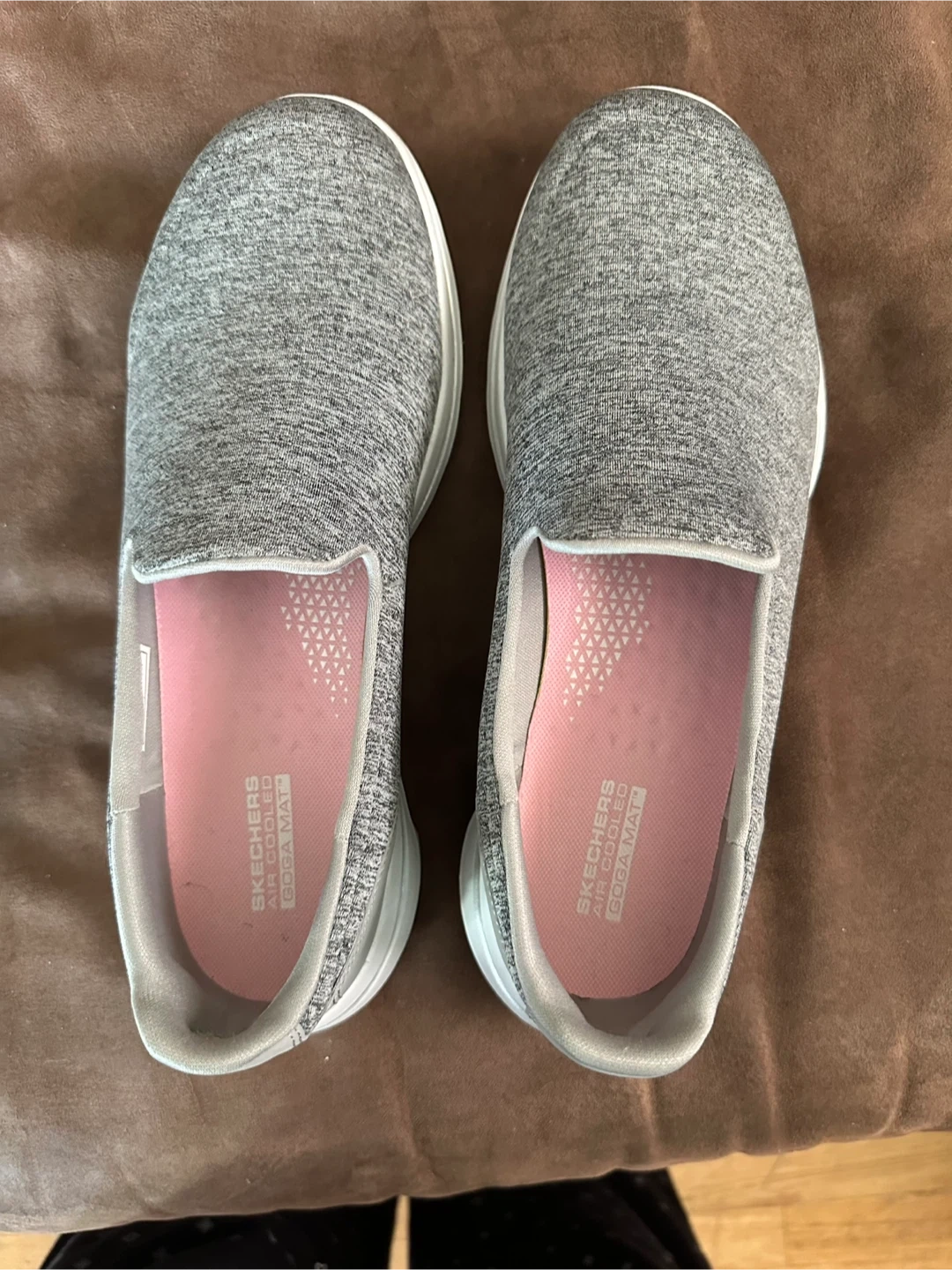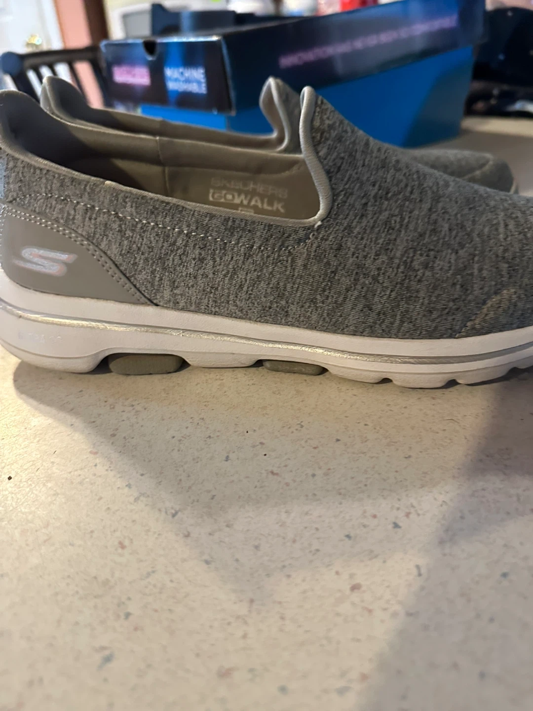 Selling a pair of Skechers GO WALK 5 slip-on shoes in gray. They feature ULTRA GO cushioning and air-cooled Goga Mat insoles for comfort. The shoes are also machine washable! They have some signs of wear on the soles. *MAKE AN OFFER*