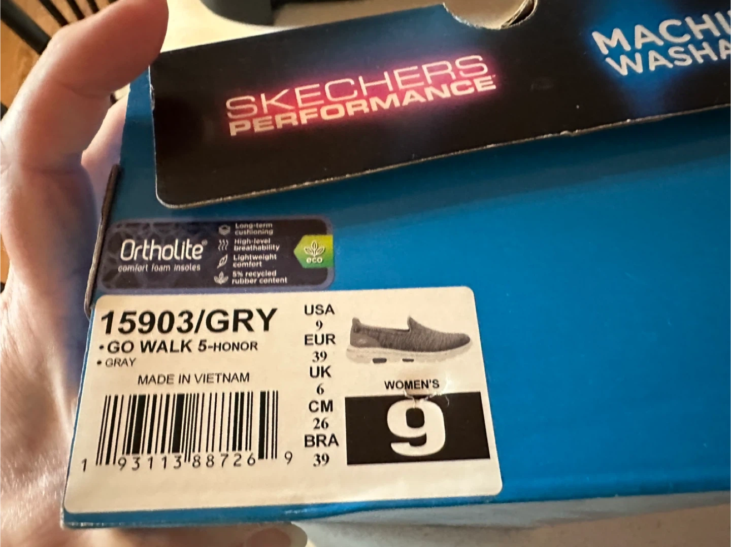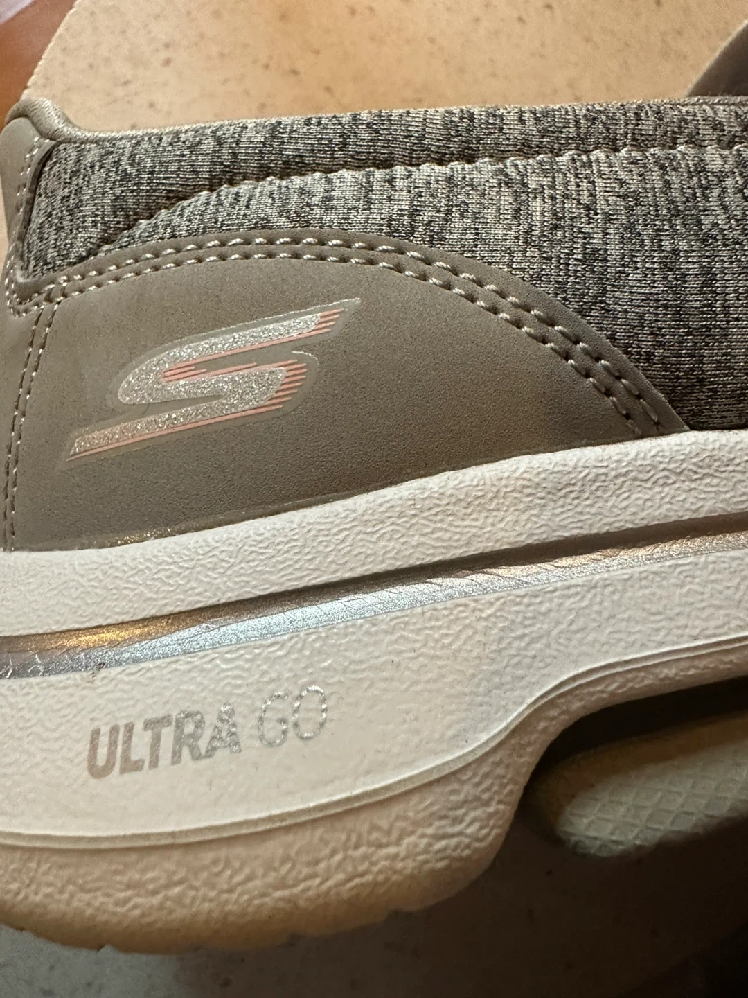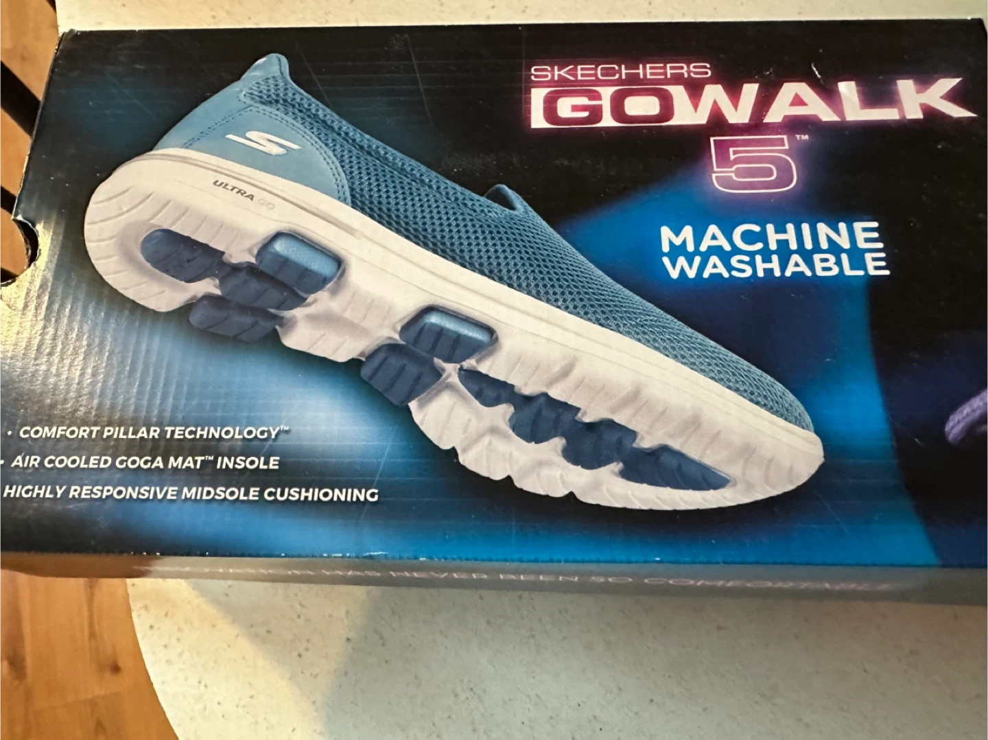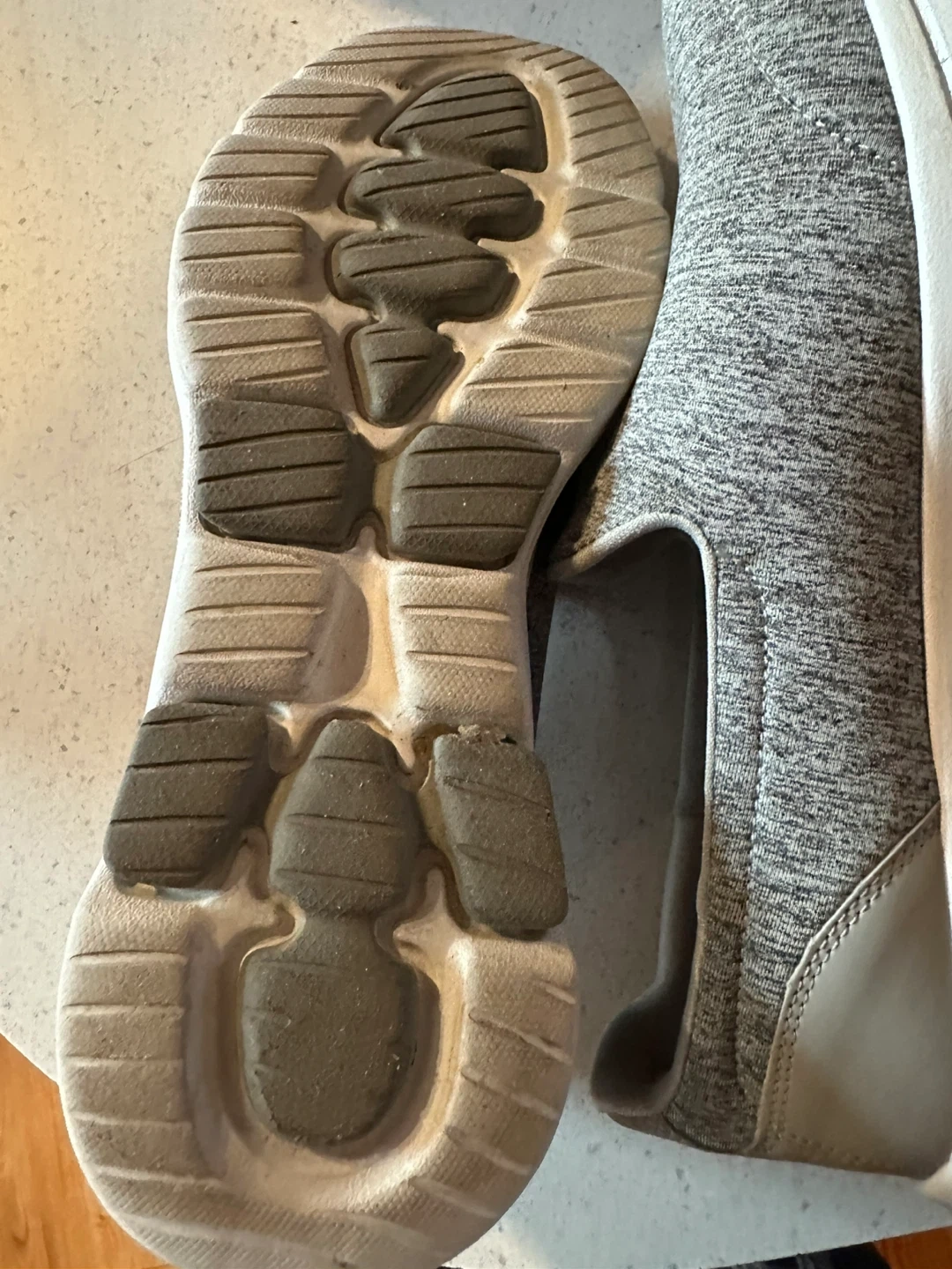 Selling a pair of Skechers GO WALK 5 slip-on shoes in gray. They feature ULTRA GO cushioning and air-cooled Goga Mat insoles for comfort. The shoes are also machine washable! They have some signs of wear on the soles. *MAKE AN OFFER*