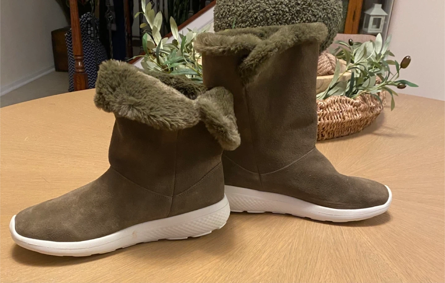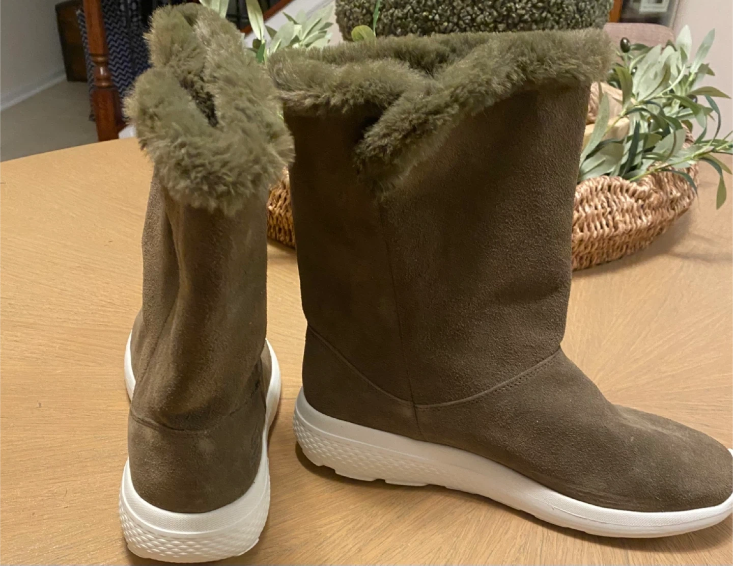 10Selling a pair of New Skechers GoGa winter boots in a women's size 8. These boots are a stylish suede olive green color with a faux fur trim, perfect for keeping your feet warm and comfortable during the colder months. They feature lightweight design, making them great for everyday wear.