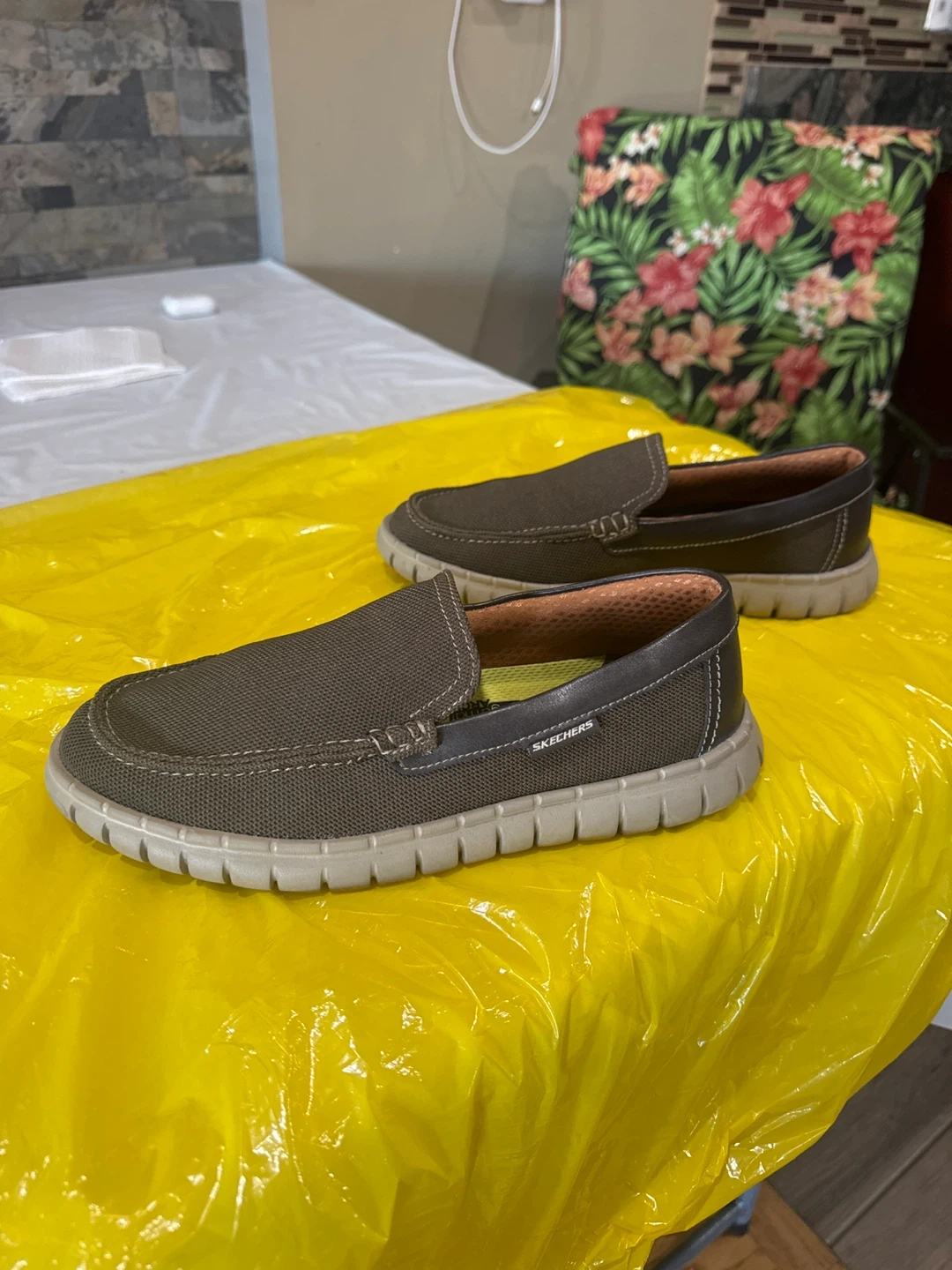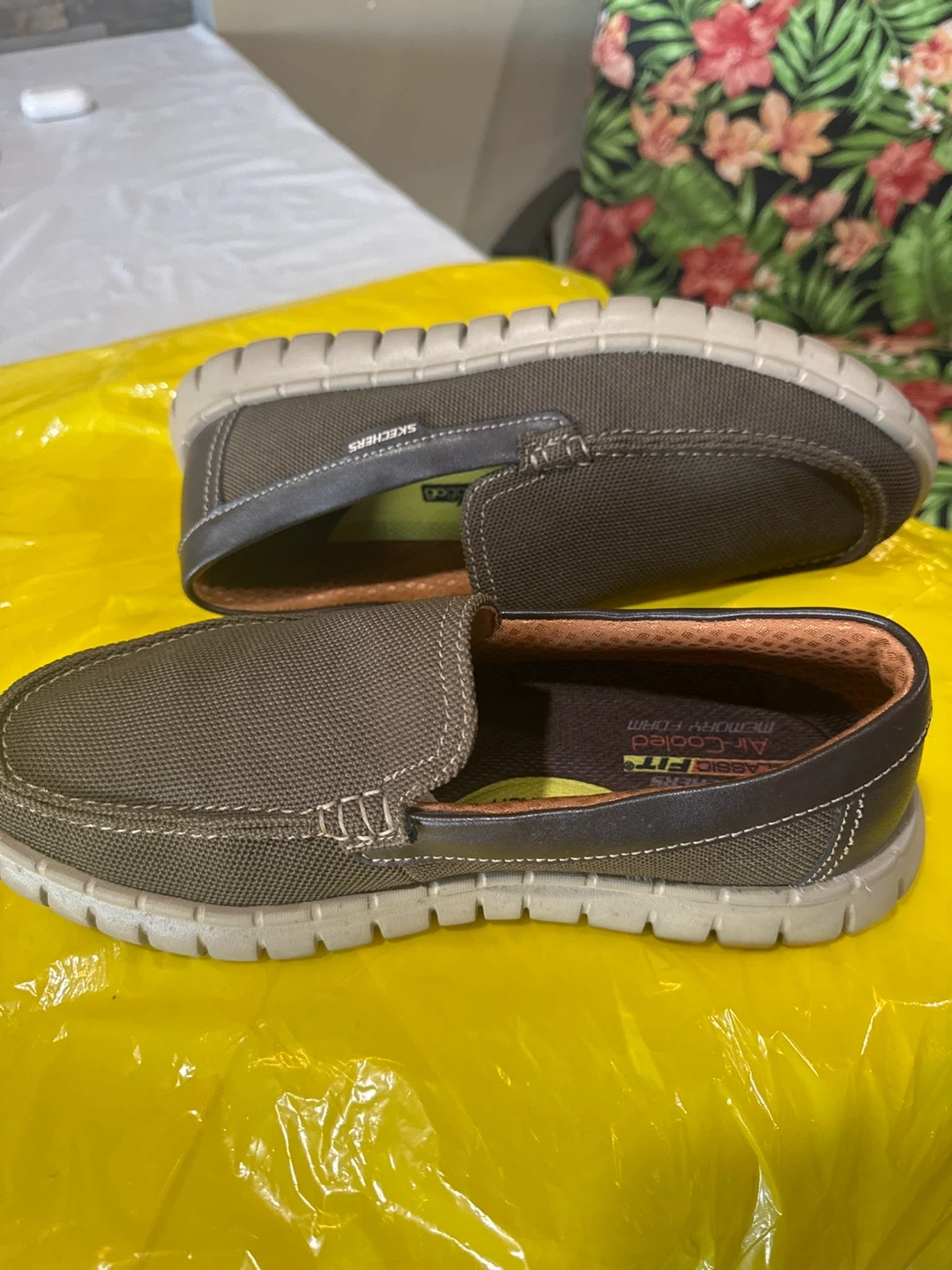 28Selling a pair of size 9 Skechers men's slip-on loafers. They're in great shape and ready for a new home! These are super comfortable with air-cooled memory foam insoles. Perfect for everyday wear!