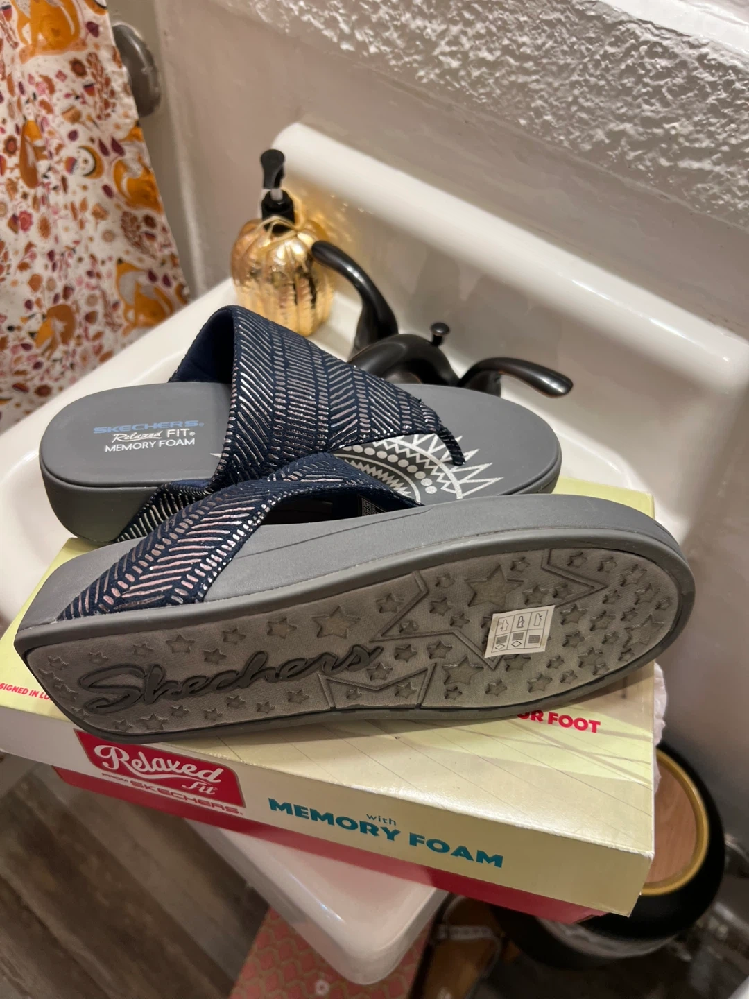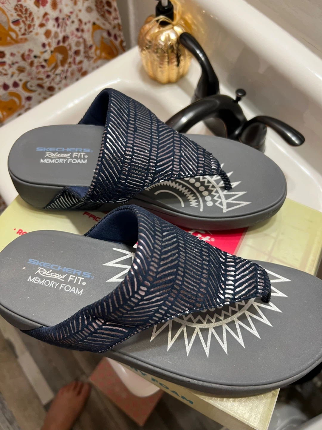 These Skechers Relaxed Fit sandals feature memory foam for extra comfort! They have a stylish navy blue and silver design. Perfect for casual wear and warm weather