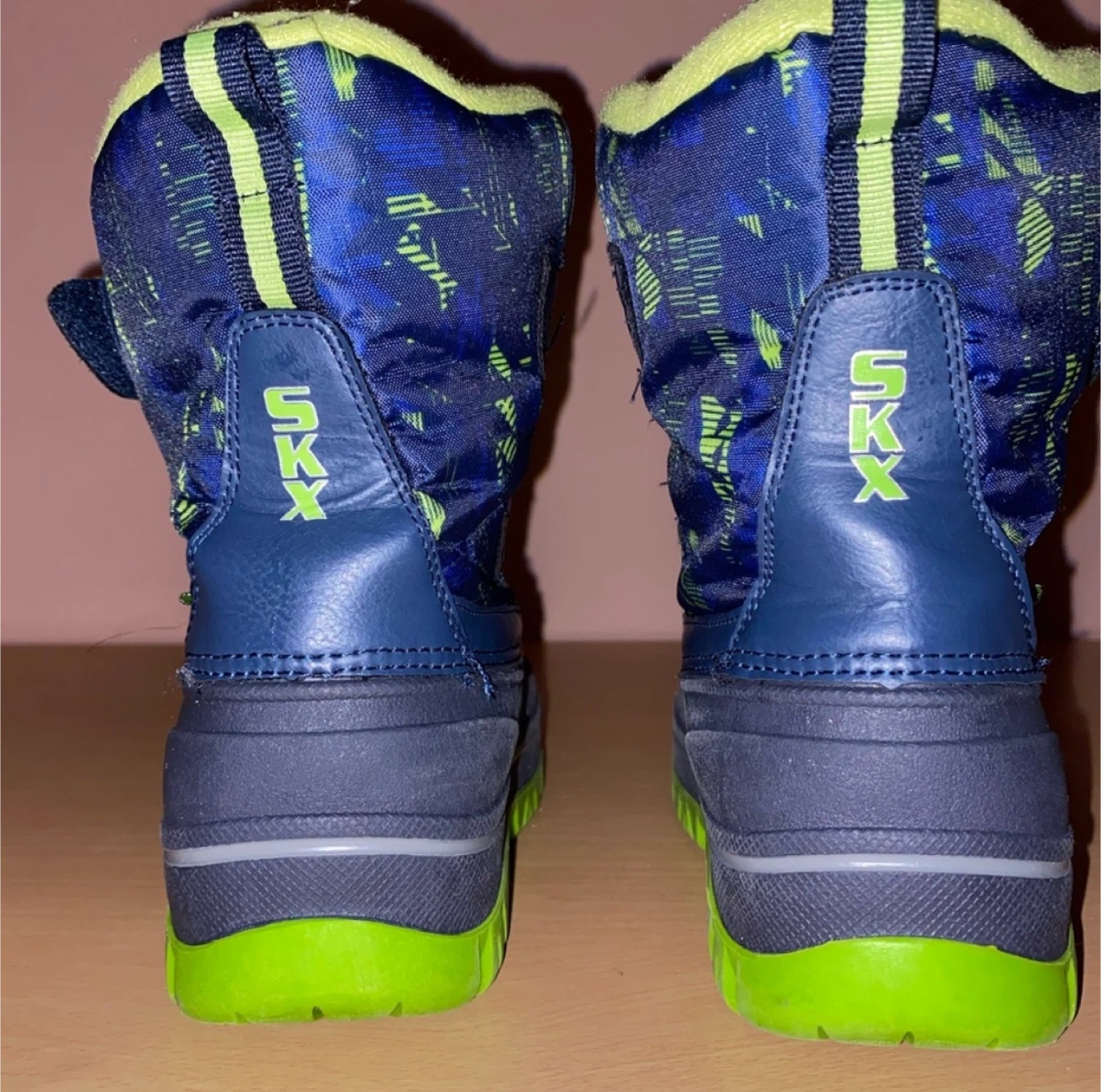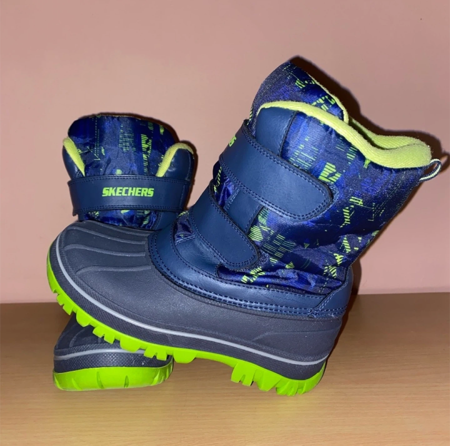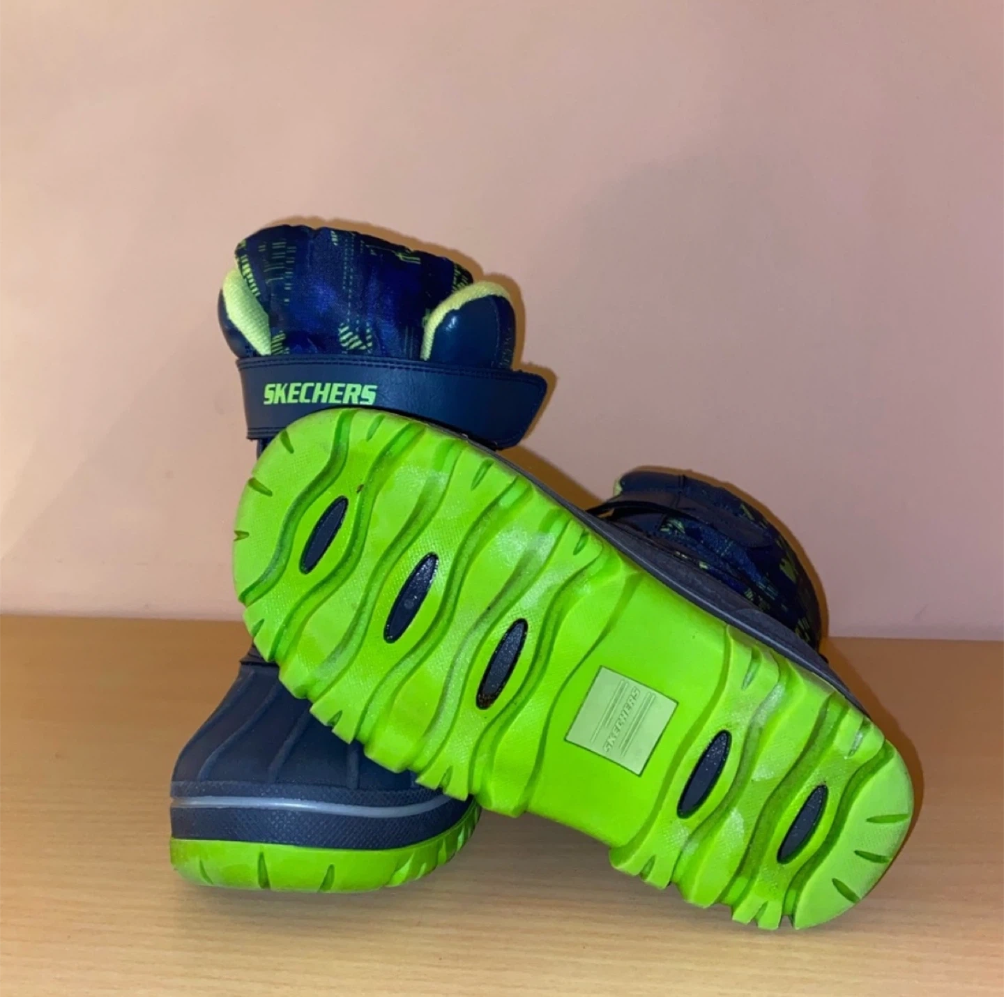 These Skechers toddler snow boots are perfect for keeping little feet warm and dry! They are a size 12 in US sizing. The upper material is synthetic/textile. The color code is NVLM.