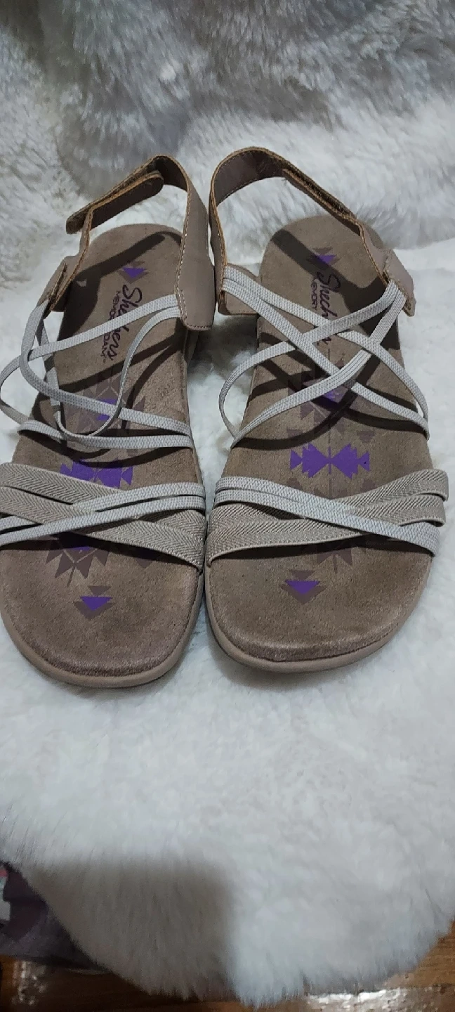 10Selling a pair of Skechers women's sandals in size 8. They feature a strappy design and are in good condition, perfect for casual wear!