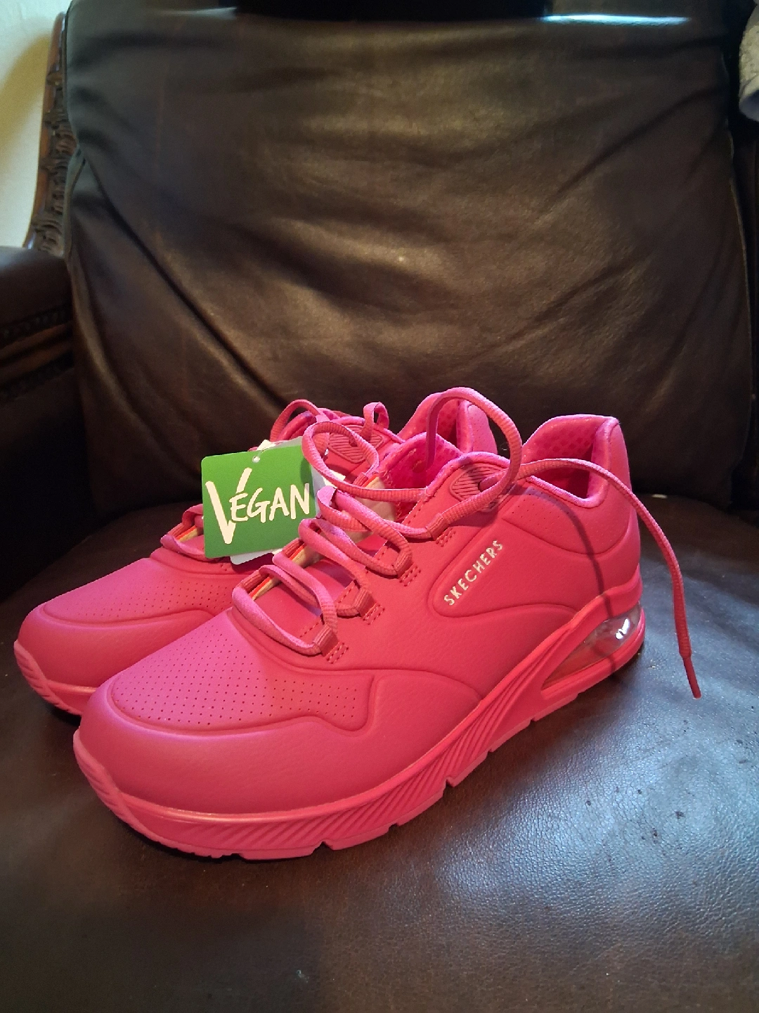 These Skechers Women's Uno - Lite Vegan Sneakers are in excellent condition and ready for a new home! The vibrant pink color is sure to make a statement. Plus, they're vegan-friendly! They are lightweight and portable, making them perfect for everyday wear