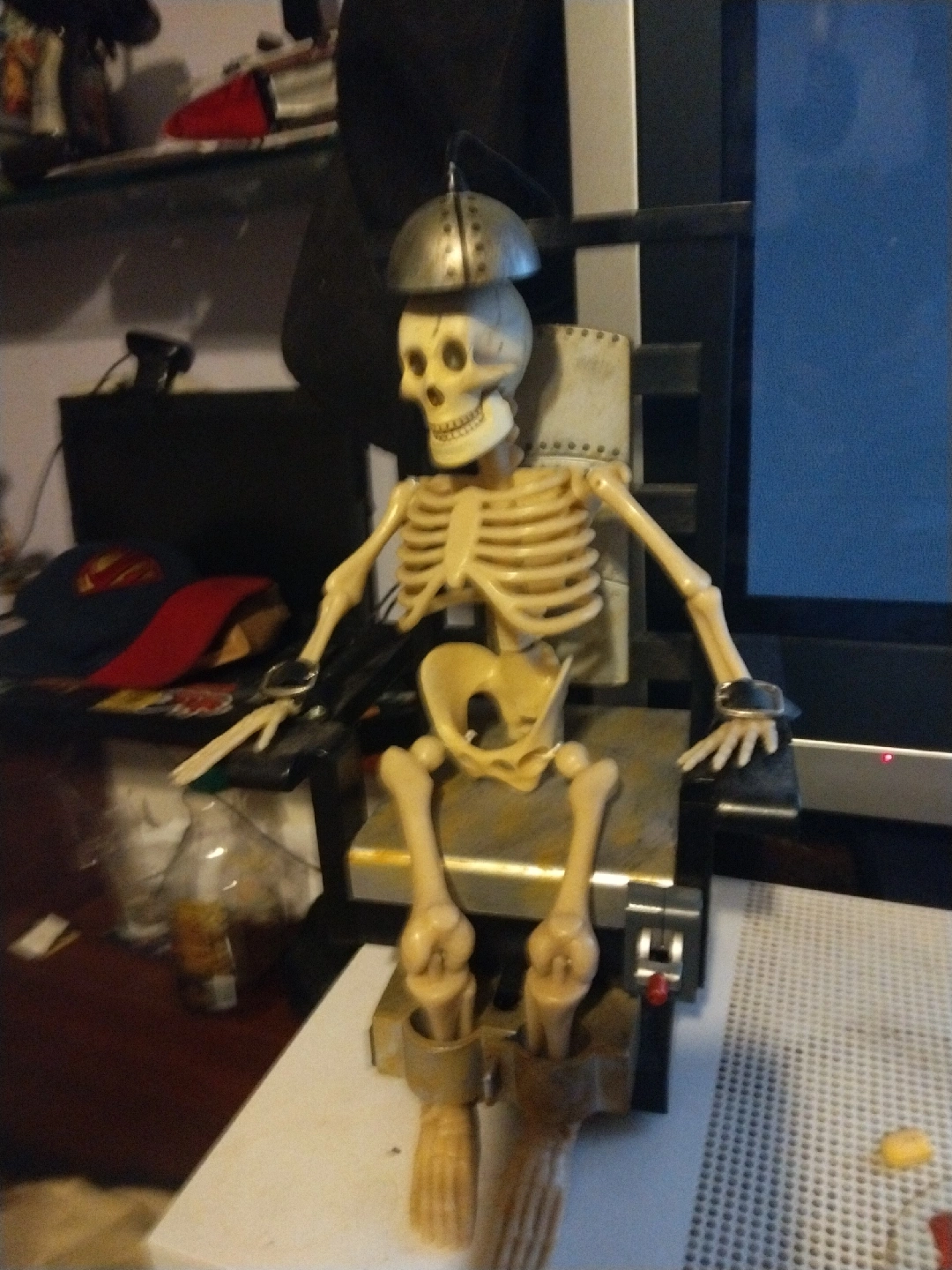 15Here's a unique skeleton decoration sitting in an electric chair! It's a fun and spooky piece to add to your collection or Halloween decor