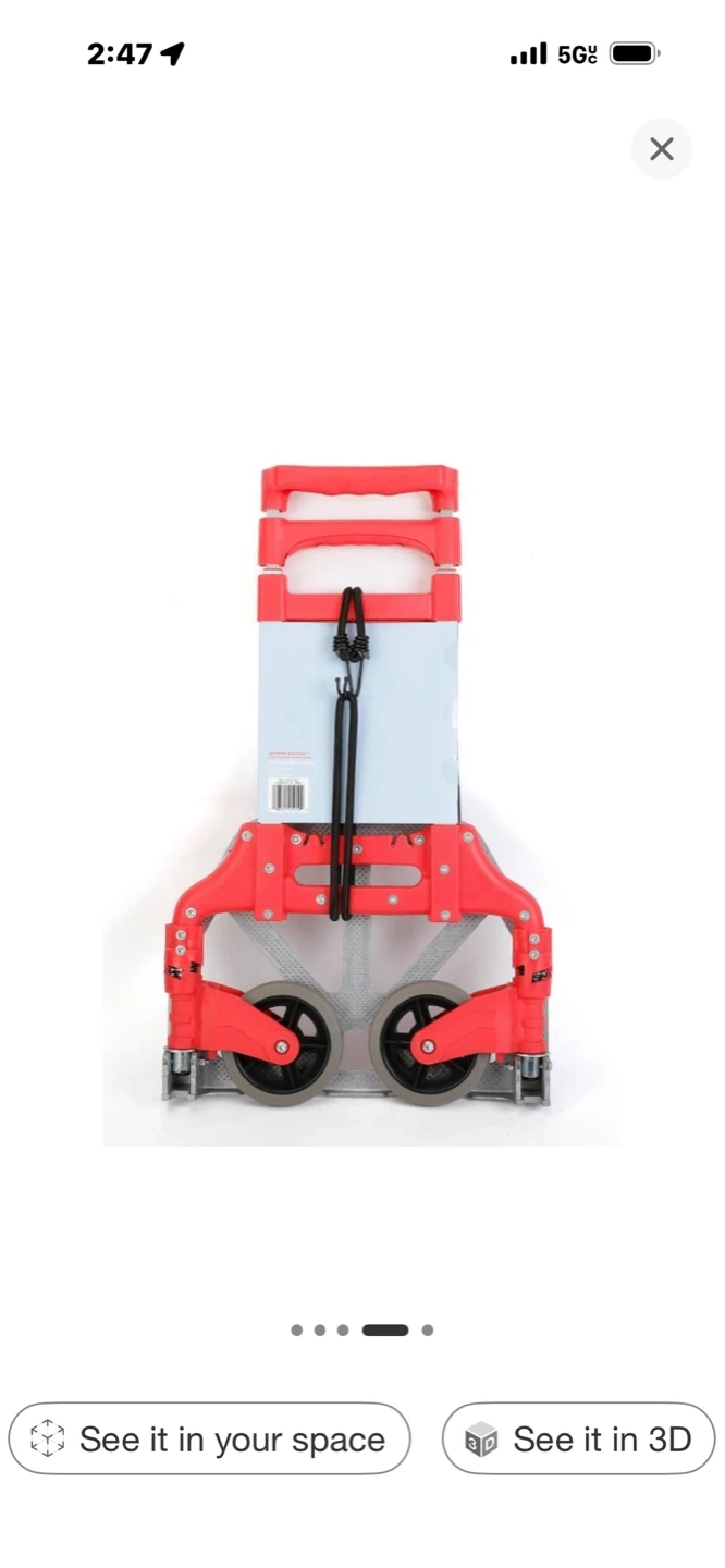 This folding utility cart is designed for convenience. It's made with durable materials and includes a bungee cord for securing items. The cart supports up to 110 lbs. It's useful for hauling groceries or other items to and from your car.