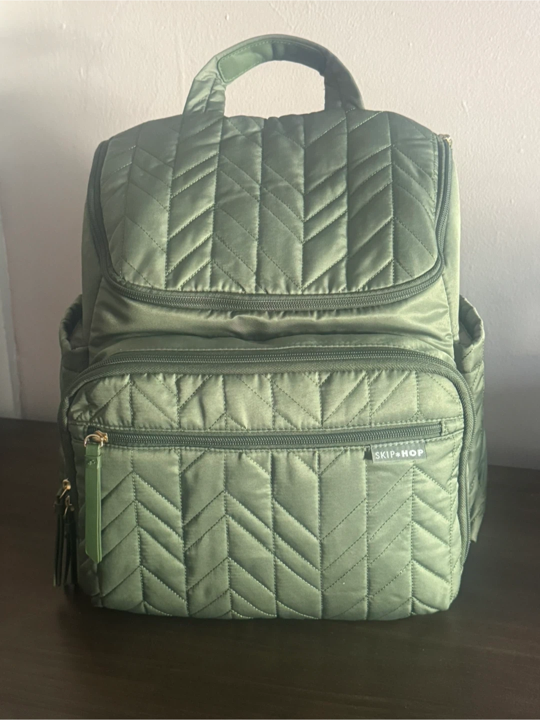 Selling a Skip Hop diaper backpack in olive green! It's in great condition and ready for a new home. This stylish and functional backpack is perfect for keeping all your baby essentials organized and accessible on the go. It features multiple compartments and pockets to hold diapers, wipes, bottles, and more. A great bag for any parent!