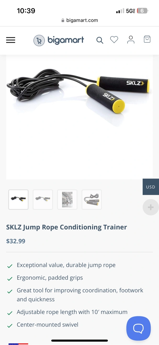 Selling a SKLZ jump rope conditioning trainer! It has ergonomic, padded grips and adjustable rope length with 10' maximum. It's a great tool for improving coordination, footwork, and quickness. Originally bought for $32.99