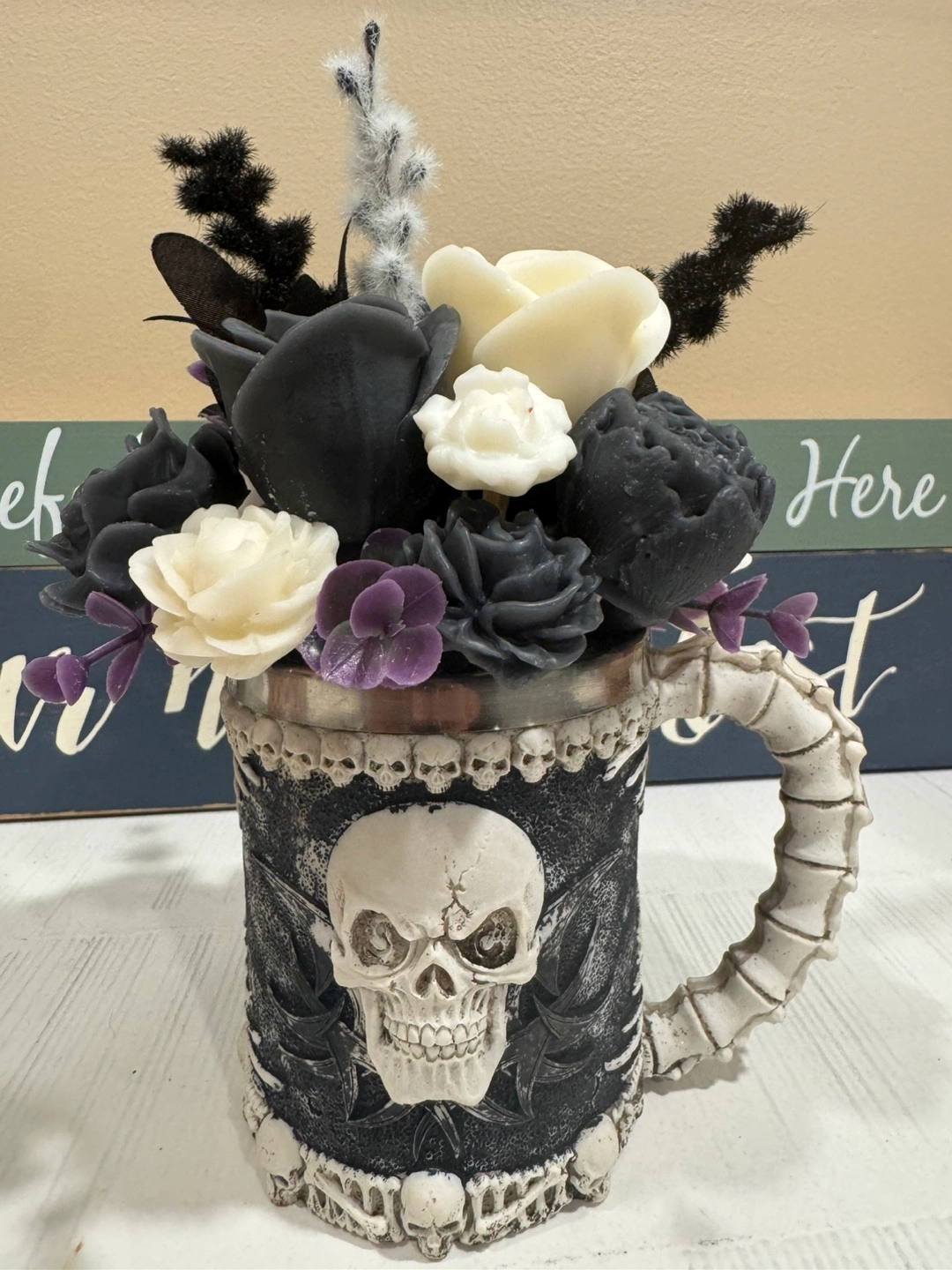 60Selling a unique skull mug with a wax floral arrangement. The mug has a skull design and a decorative handle. It's filled with black, white, and purple flowers. Perfect for Halloween or gothic decor!