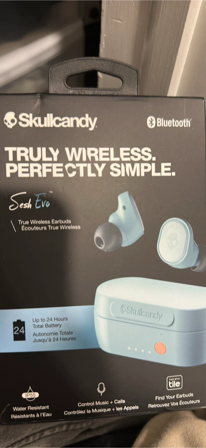 10Selling a brand new pair of Skullcandy Sesh Evo True Wireless Earbuds! They are truly wireless and perfectly simple to use. - Up to 24 hours of total battery life - IP55 water resistant - Control music and calls - Find your earbuds with Tile