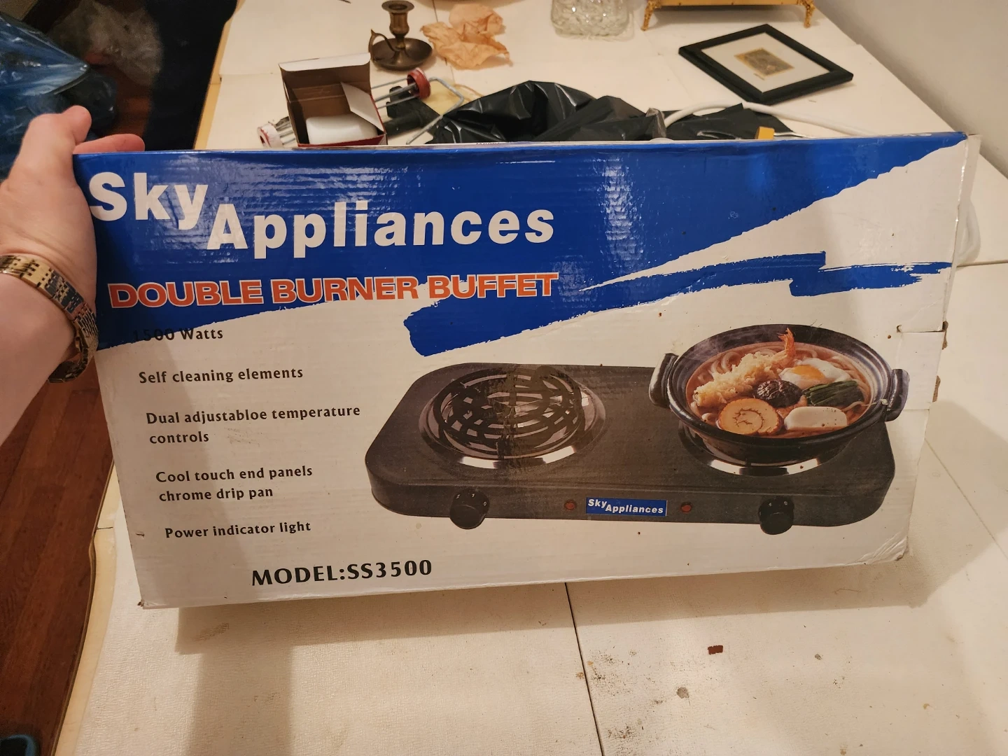 73Selling a Sky Appliances Double Burner Buffet, model SS3500. It's in its original box and ready for a new home. This buffet burner features: - 1500 Watts - Self-cleaning elements - Dual adjustable temperature controls - Cool touch end panels - Chrome drip pan - Power indicator light