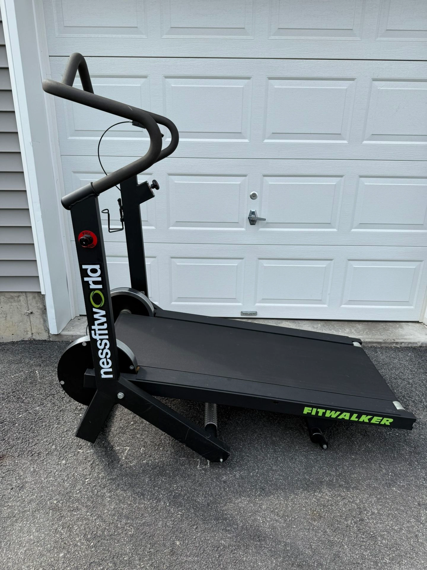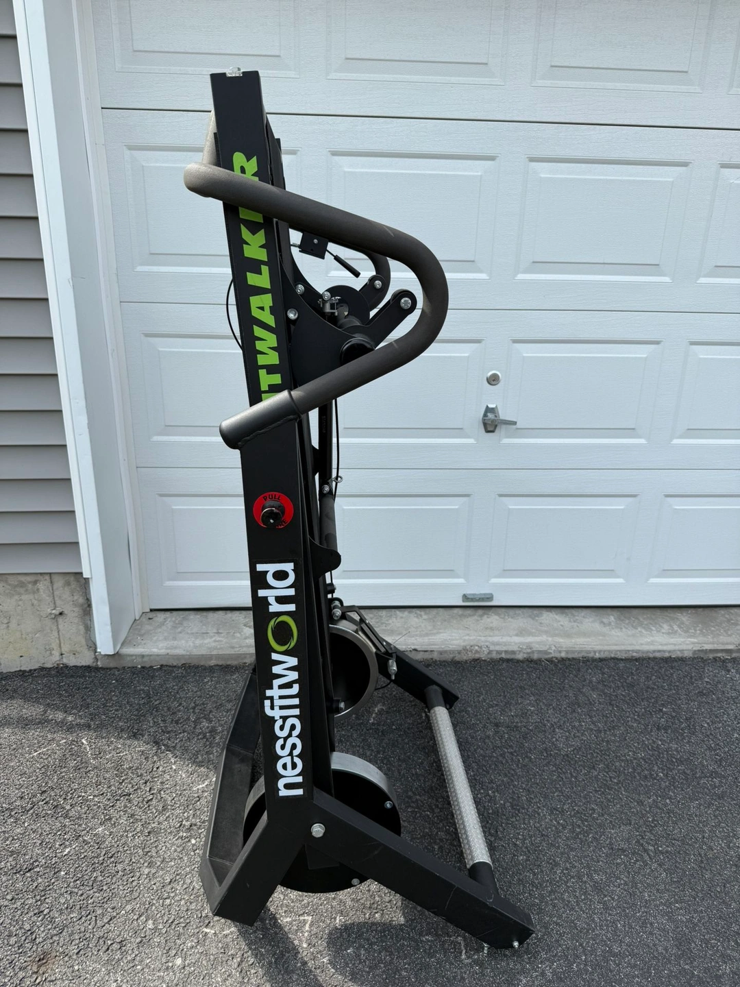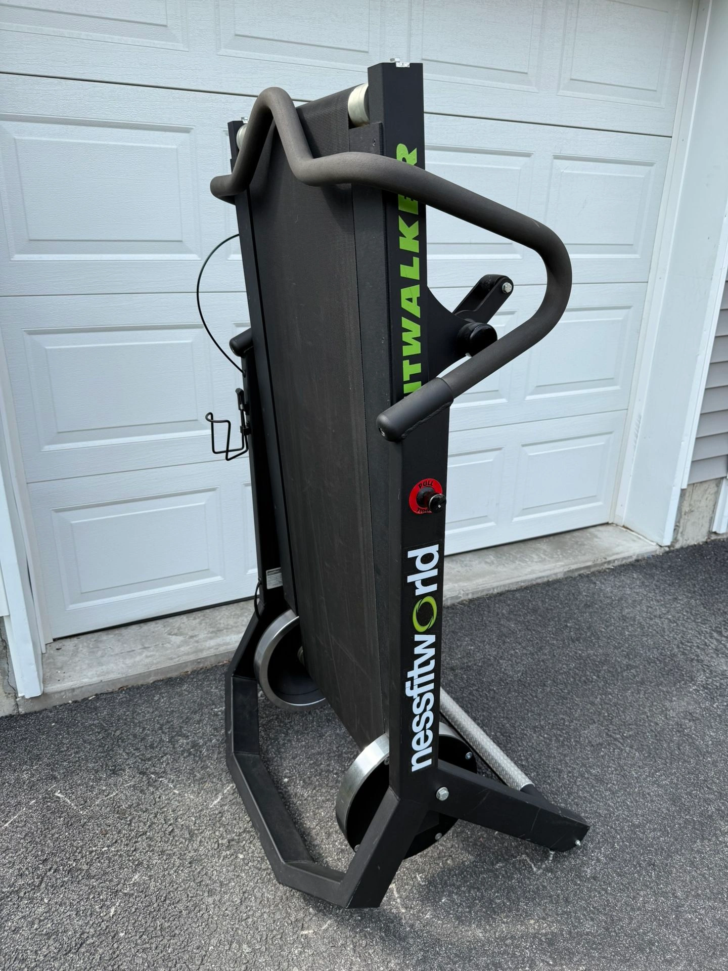 15NessFitWorld Fit Walker, I believe this is made in Italy. This treadmill does it all. It’s a Fly Wheel variable resistant manual treadmill. There are different levels of resistance. It is a push pull treadmill and replicates the feeling of pushing or pulling a sled. You can go forwards and backwards on this treadmill. Very similar to The Tib Bar Guy Sled Tred. Folds up compactly when not in use to save a ton of space. Does not use an electric source and can be used anywhere!