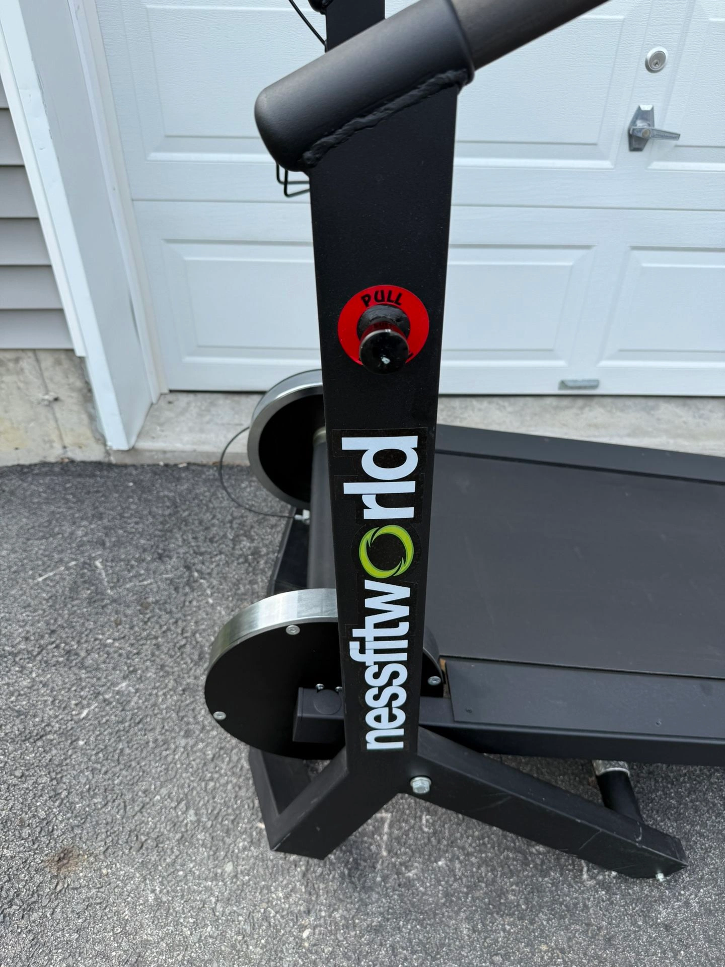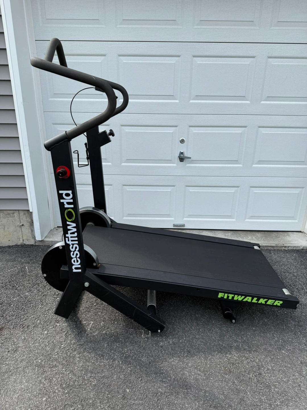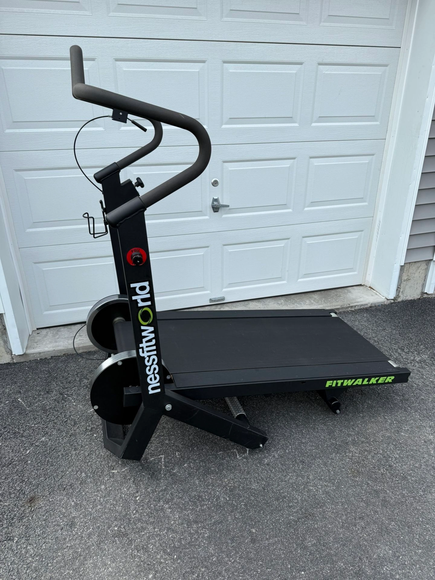 15NessFitWorld Fit Walker, I believe this is made in Italy. This treadmill does it all. It’s a Fly Wheel variable resistant manual treadmill. There are different levels of resistance. It is a push pull treadmill and replicates the feeling of pushing or pulling a sled. You can go forwards and backwards on this treadmill. Very similar to The Tib Bar Guy Sled Tred. Folds up compactly when not in use to save a ton of space. Does not use an electric source and can be used anywhere!