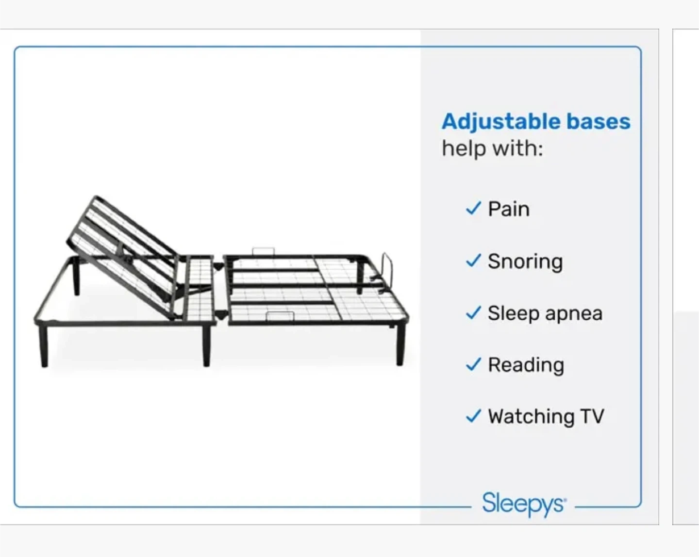 Selling a Sleepys adjustable bed frame! Adjustable bases help with: - Pain - Snoring - Sleep apnea - Reading - Watching TV